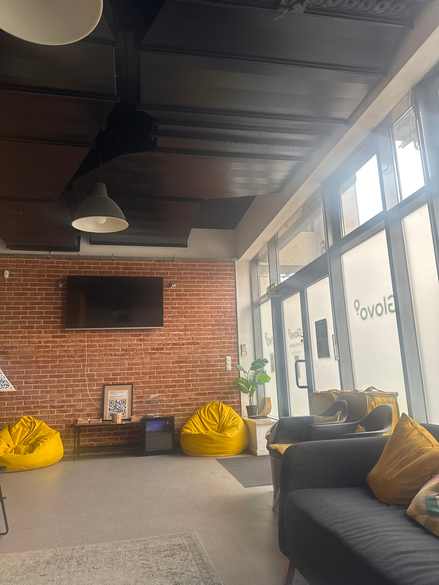 The image shows an interior space with a modern design. The most prominent features are the glazed roof with "Ovola" branding, a brick wall with a mounted television, and a seating area with a gray sofa and yellow bean bag chairs. The space is brightly lit, likely due to the natural light coming through the glazed roof. Warsaw, Poland is assumed from context clues. | Open Wire