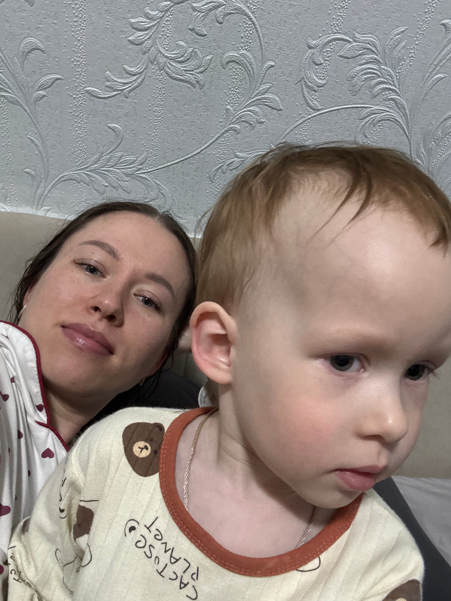 The image shows a close-up view of a woman and a baby, likely indoors. The woman is lying down, and the baby is positioned above her, partially obscuring her face. The woman has fair skin, dark hair, and appears to be wearing light-colored sleepwear with a red trim. The baby has fair skin and light brown hair. The baby is wearing a yellow and brown shirt with an image of a bear and the word "Cactuse Planet". The background consists of a wall with a light-colored patterned design. There is no evidence of the city Ферма or Russia in the scene. The subjects are interacting in a close physical proximity. | Open Wire