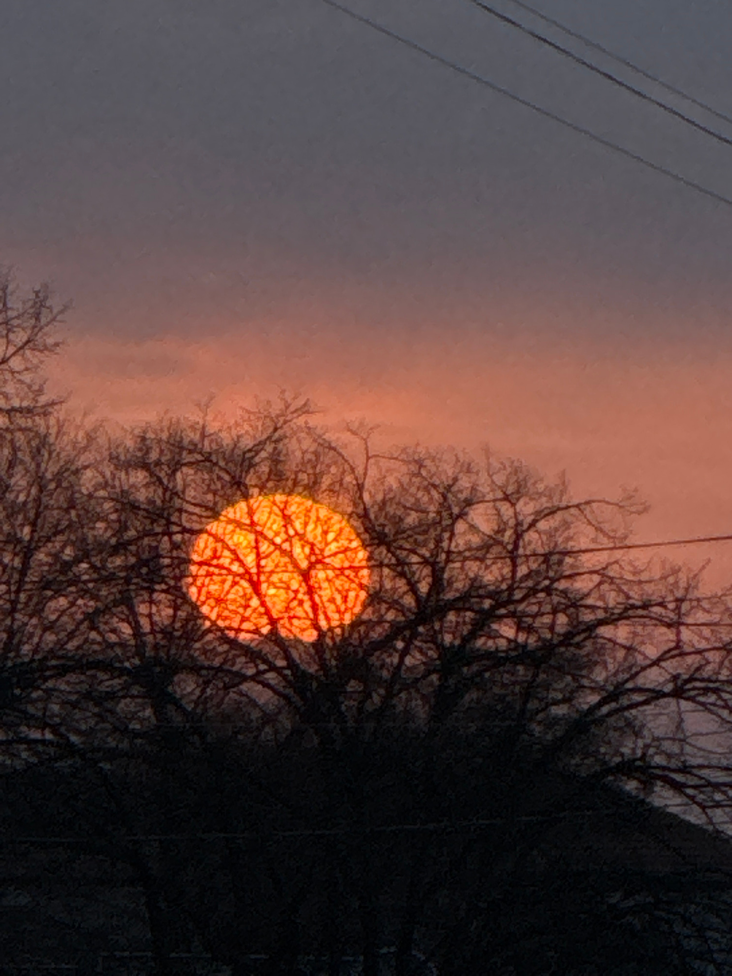 The image shows a red sun setting or rising behind a bare tree with branches silhouetted against the sky. The sky itself is a gradient of gray to orange, likely indicating dawn or dusk. Electrical wir…read more