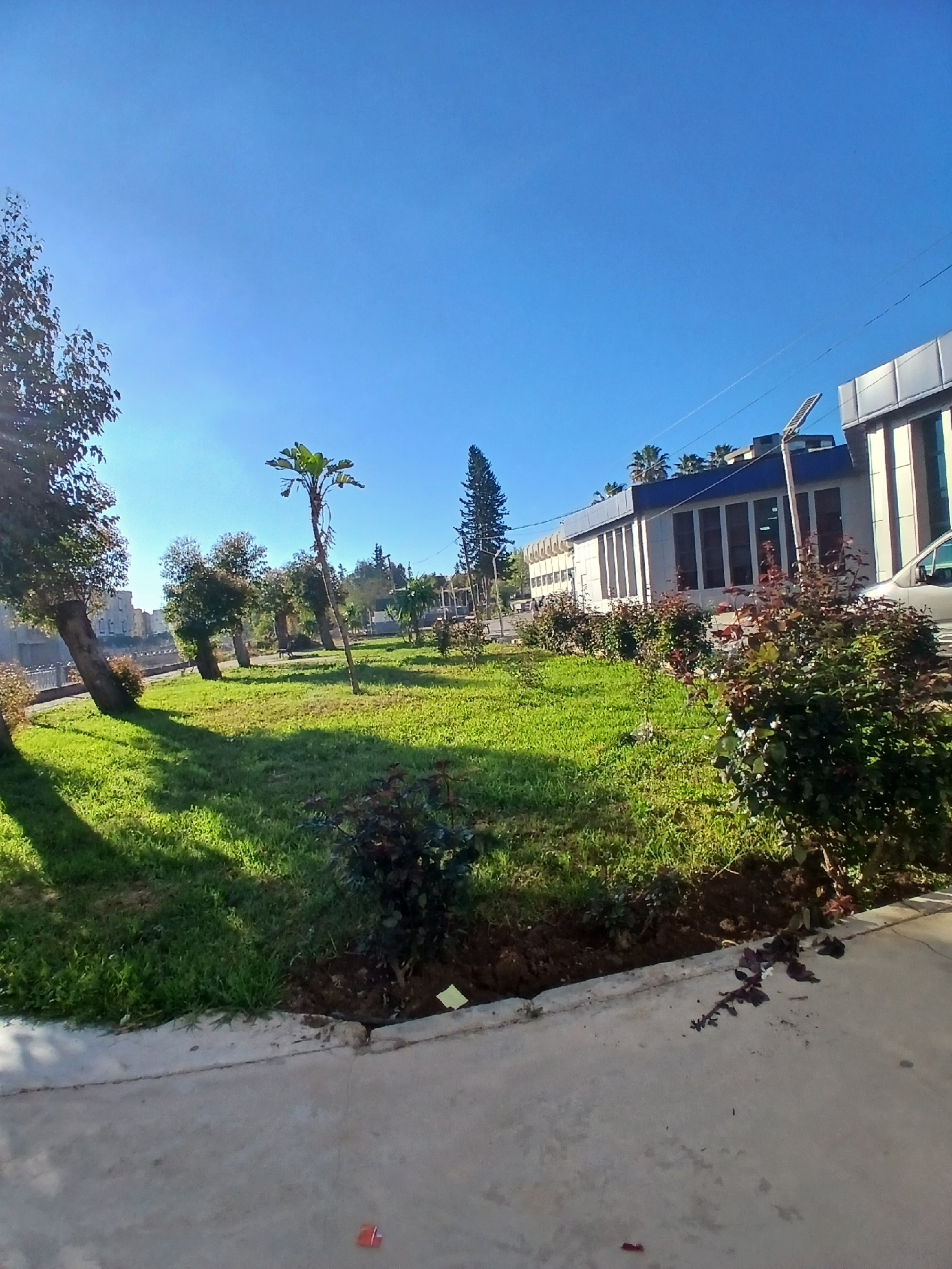 The image presents a view in Meknes, Morocco, characterized by a clear blue sky covering most of the frame. Buildings are visible along the top edge, including a modern structure with blue and white f…read more