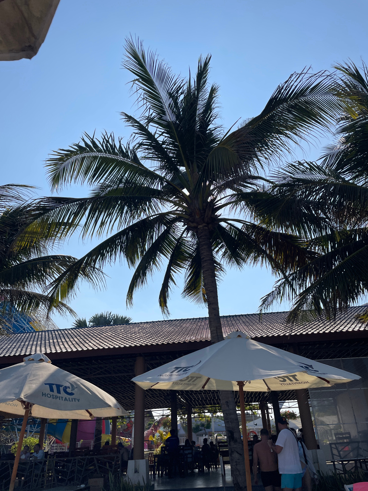 The image captures a palm tree set against a clear blue sky, possibly located in Dong Ninh Hoa, Vietnam. The tree's fronds extend in various directions, filling a significant portion of the frame. Adj…read more
