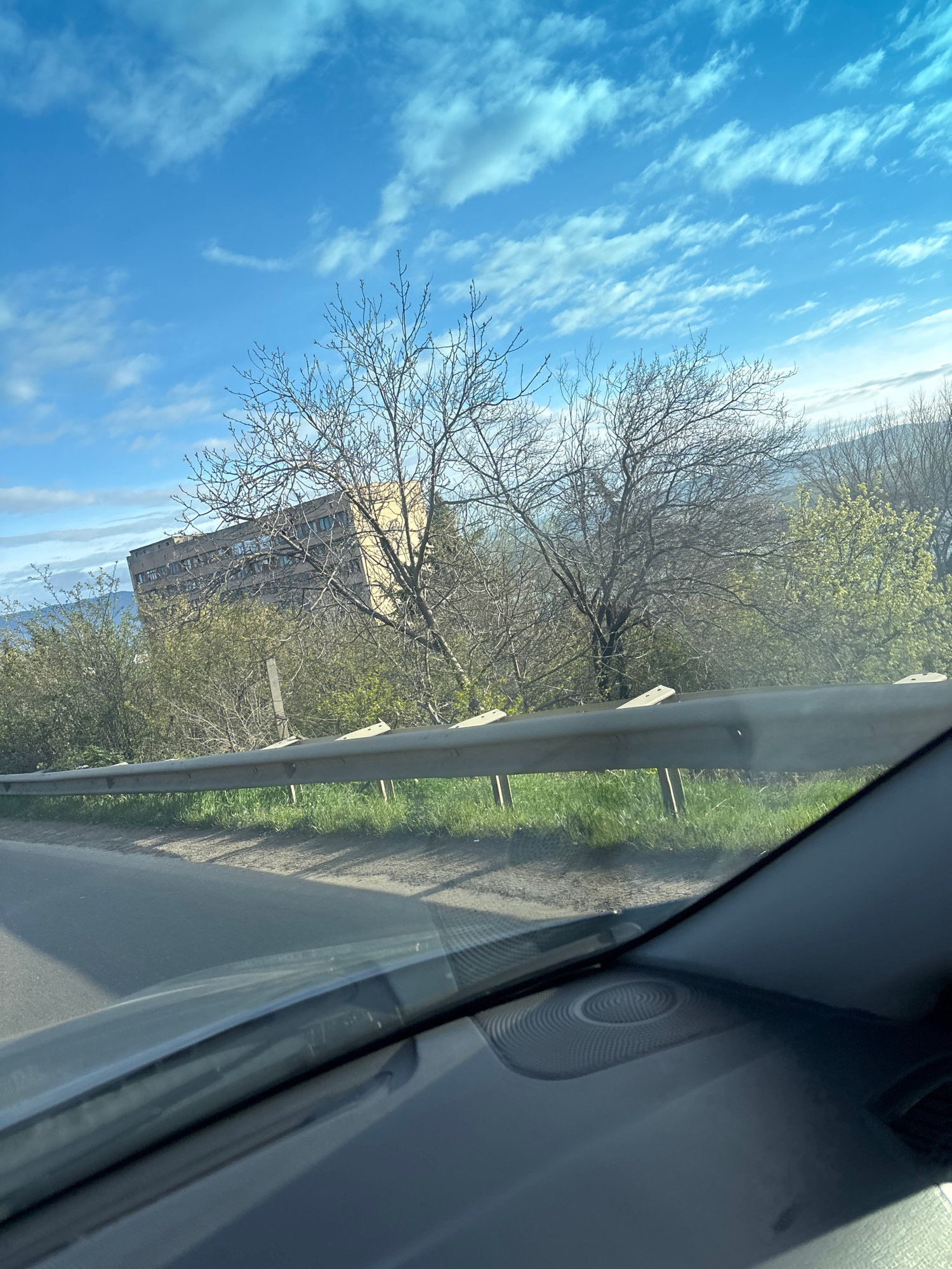 Captured through a car window, the image presents a roadside scene. To the left, a clear blue sky with scattered cirrus clouds contrasts with bare trees and budding vegetation. A multi-story building,…read more
