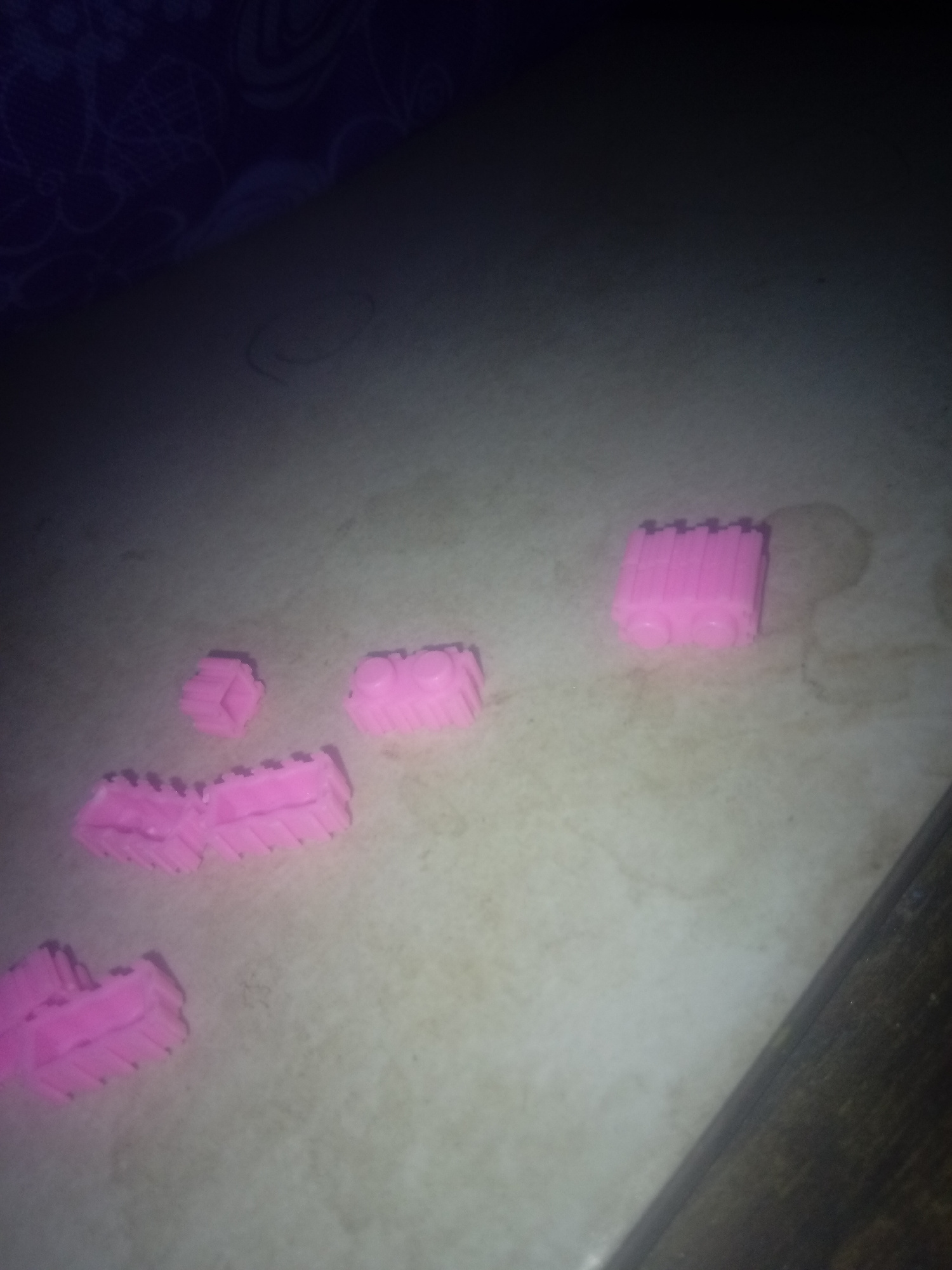 The image shows several pink toy blocks scattered on a light-colored surface. The scene appears to be indoors, with the corner of a wooden table visible in the lower right corner. The background is bl…read more