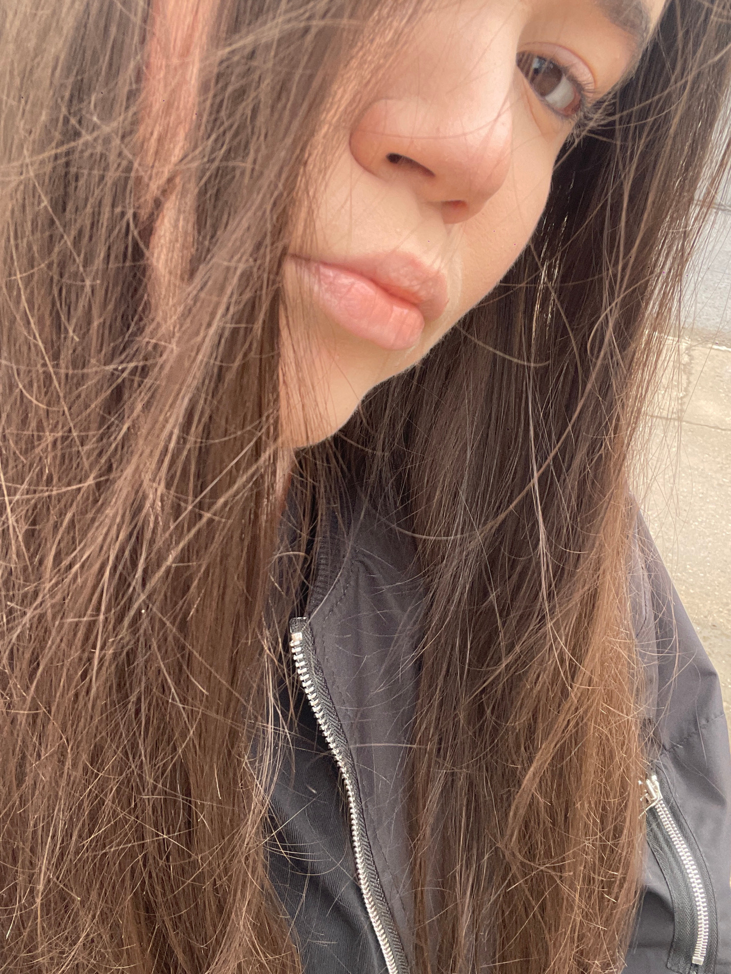 A close-up, canted, indoor shot captures a partial view of a woman's face, predominantly featuring her left eye, nose, and lips. She has fair skin and brown hair that frames her face and is partially…read more