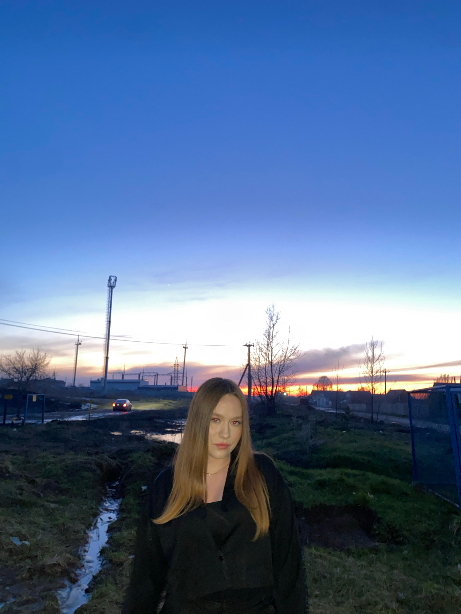 The image shows a young woman standing in an outdoor environment at dusk or dawn. The sky is a gradient of blue to orange, indicating either sunrise or sunset. In the background, there are utility pol…read more
