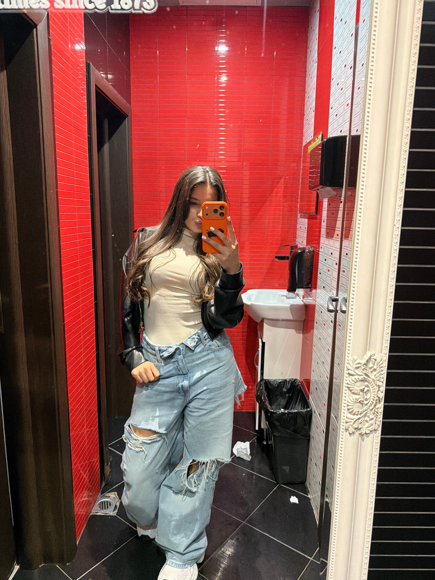 A young woman is taking a selfie in a bathroom. The bathroom has red tiled walls and black tiled floors. There is a sink and a toilet visible. The mirror has an ornate white frame. The woman is wearin…read more