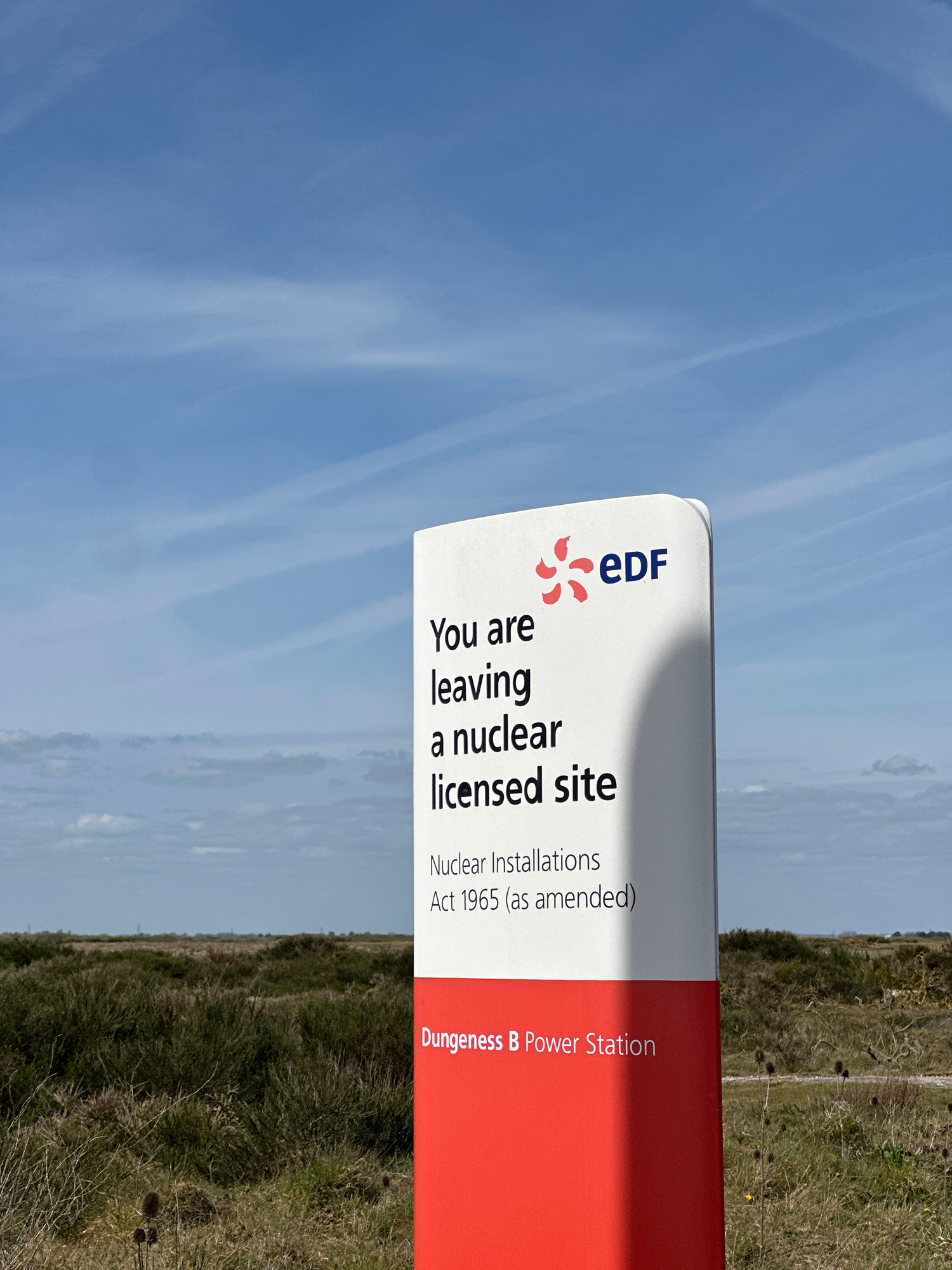 The image depicts a sign indicating the boundary of a nuclear licensed site, belonging to EDF. The sign reads "You are leaving a nuclear licensed site. Nuclear Installations Act 1965 (as amended). Dun…read more