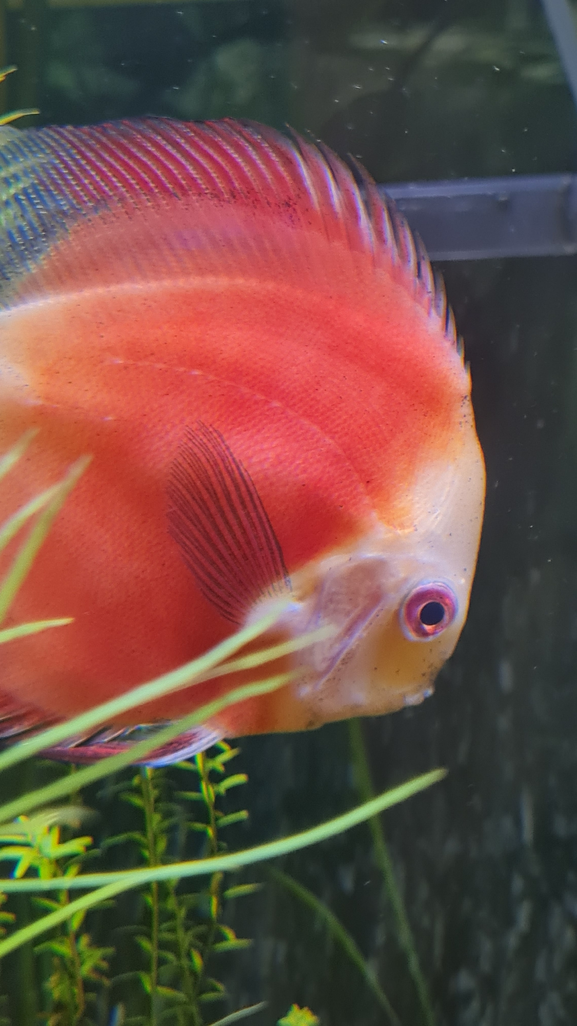 A close-up shot captures a vibrant, predominantly red-orange Discus fish swimming in an aquarium. The fish has a rounded, disc-shaped body, characteristic of its species. Its main body is a rich red-o…read more