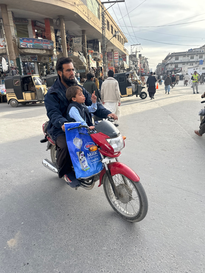 An outdoor, eye-level photograph depicts a man and a child riding a red motorcycle on an asphalt road in Quetta City Tehsil, Pakistan, under an overcast sky. A man with a dark beard, wearing a dark bl…read more