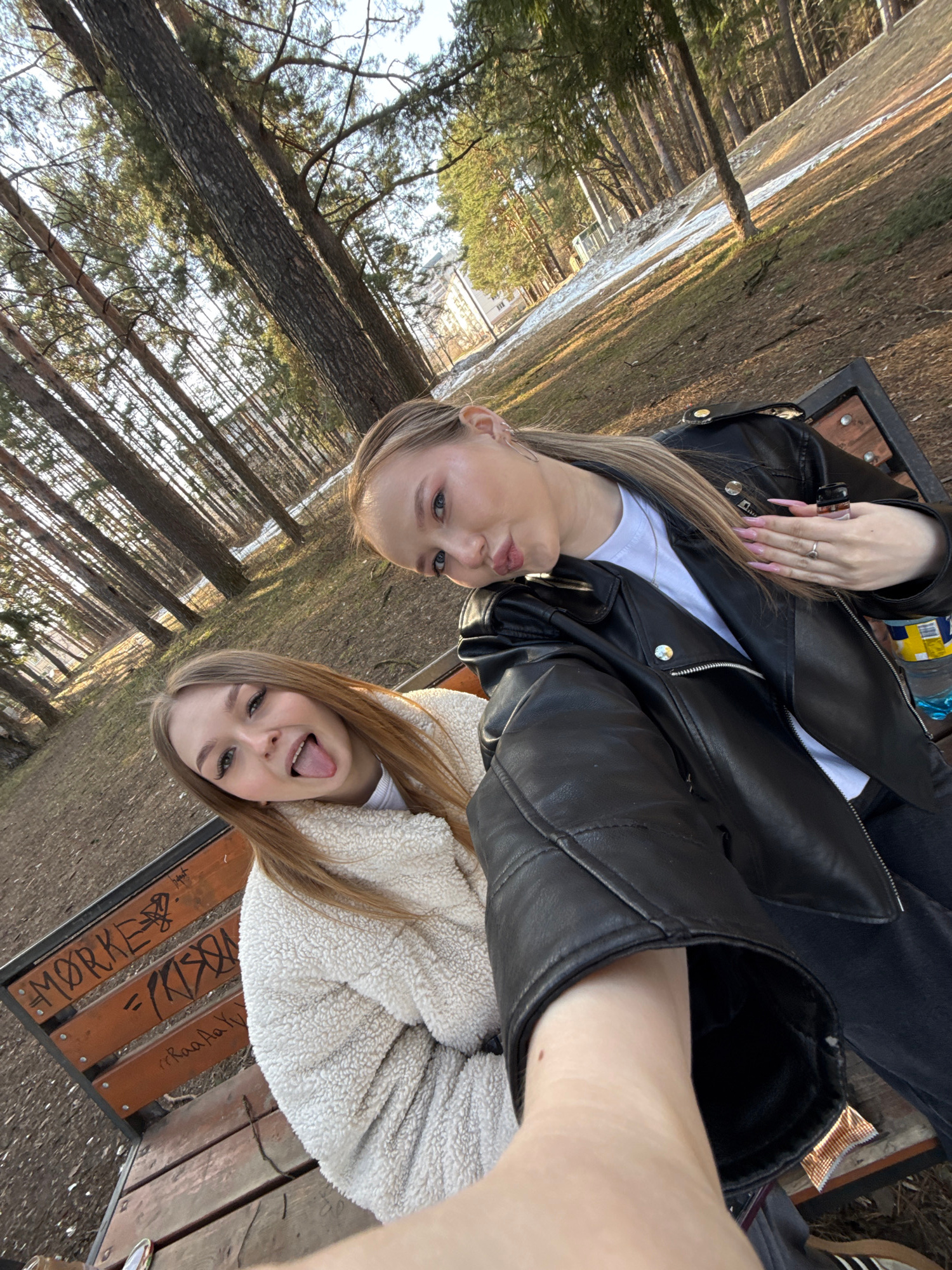 Two young women are sitting on a wooden bench in an outdoor environment. The bench has graffiti on it. One woman is wearing a black leather jacket over a white t-shirt, while the other is wearing a liβ¦read more