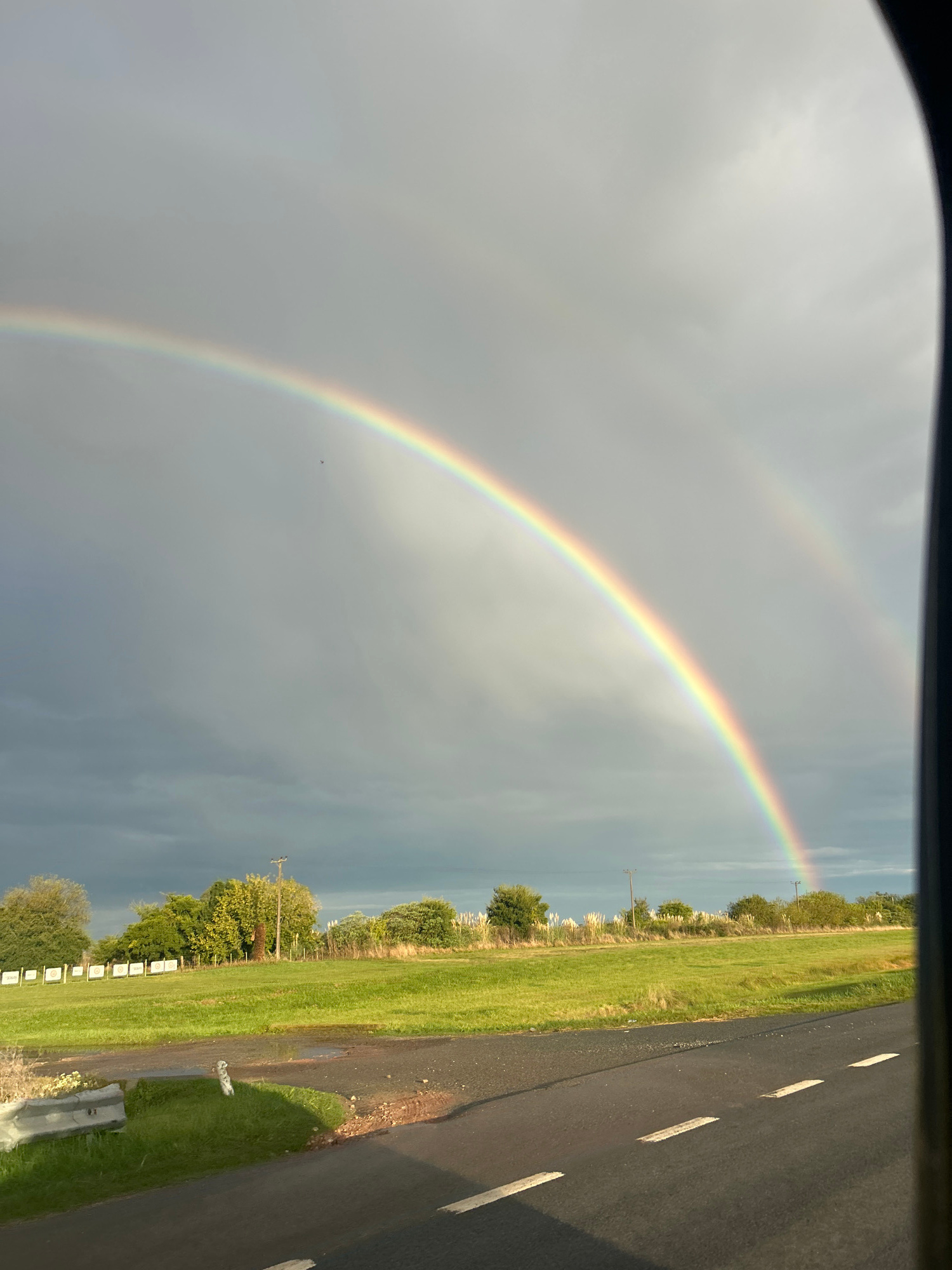 The image shows a double rainbow in Chascomús, Argentina. The view is from inside a vehicle. To the right, a paved road with white lane markings runs alongside a grassy field. The field has trees, bus…read more