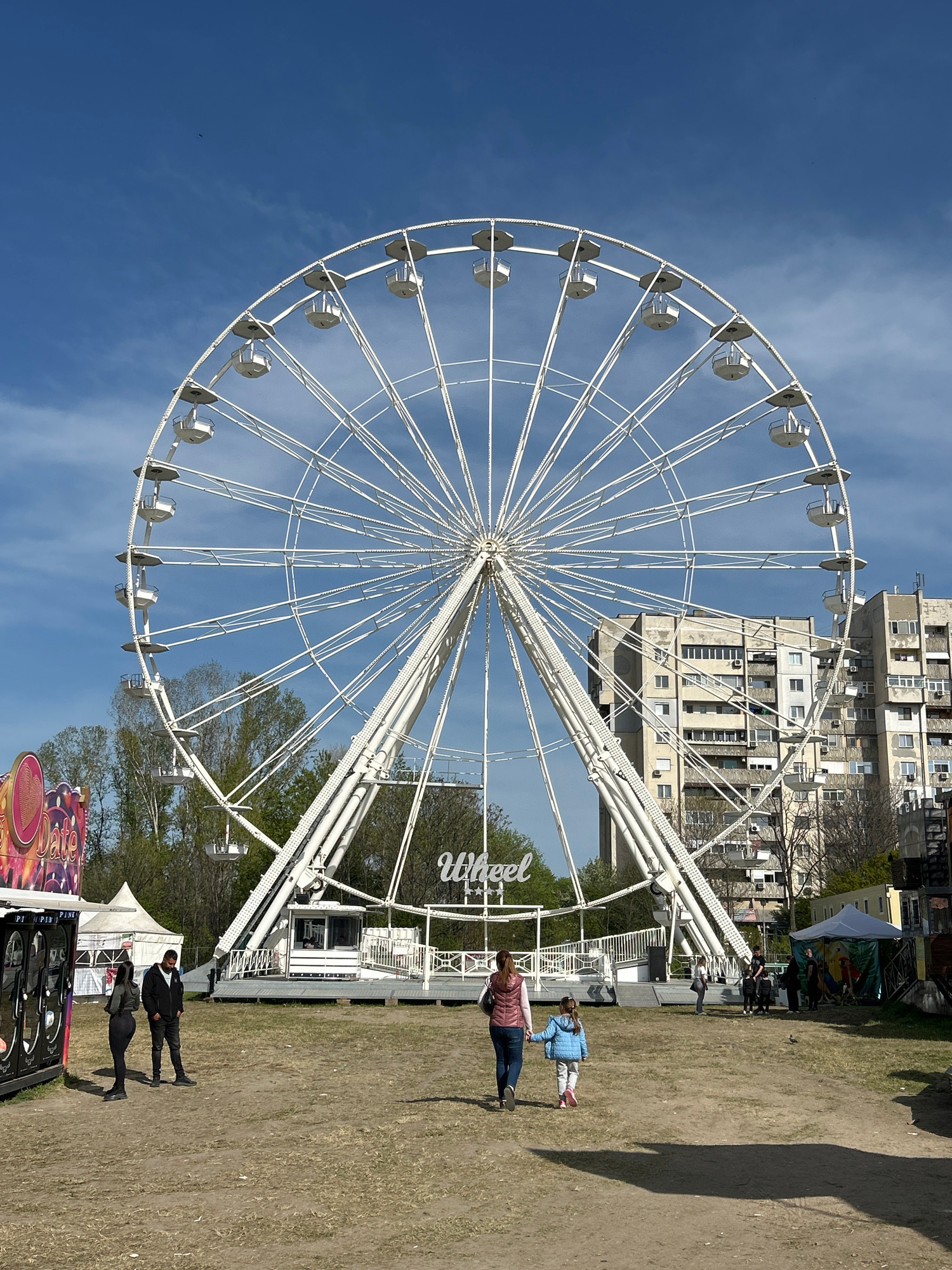 This image depicts a vibrant outdoor scene dominated by a large, white Ferris wheel positioned on the left side of the frame. The Ferris wheel is intricately designed with numerous spokes and passenge…read more