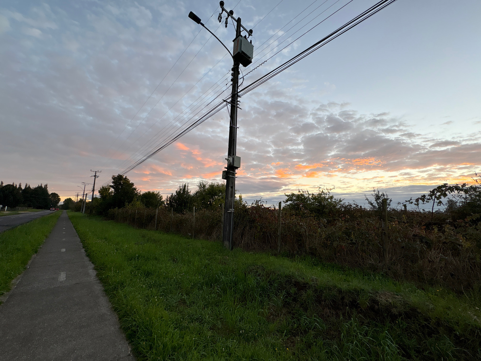 The image shows a concrete sidewalk running alongside a grassy area with shrubs and a wire fence. A utility pole with a transformer and wires dominates the middle ground. In the distance, there are trees, other utility poles, and a road with a vehicle. The sky is cloudy with hues of orange and grey, suggesting either sunrise or sunset. The location is likely in Purranque, Chile, judging by the geographical context and features present in the image. | Open Wire