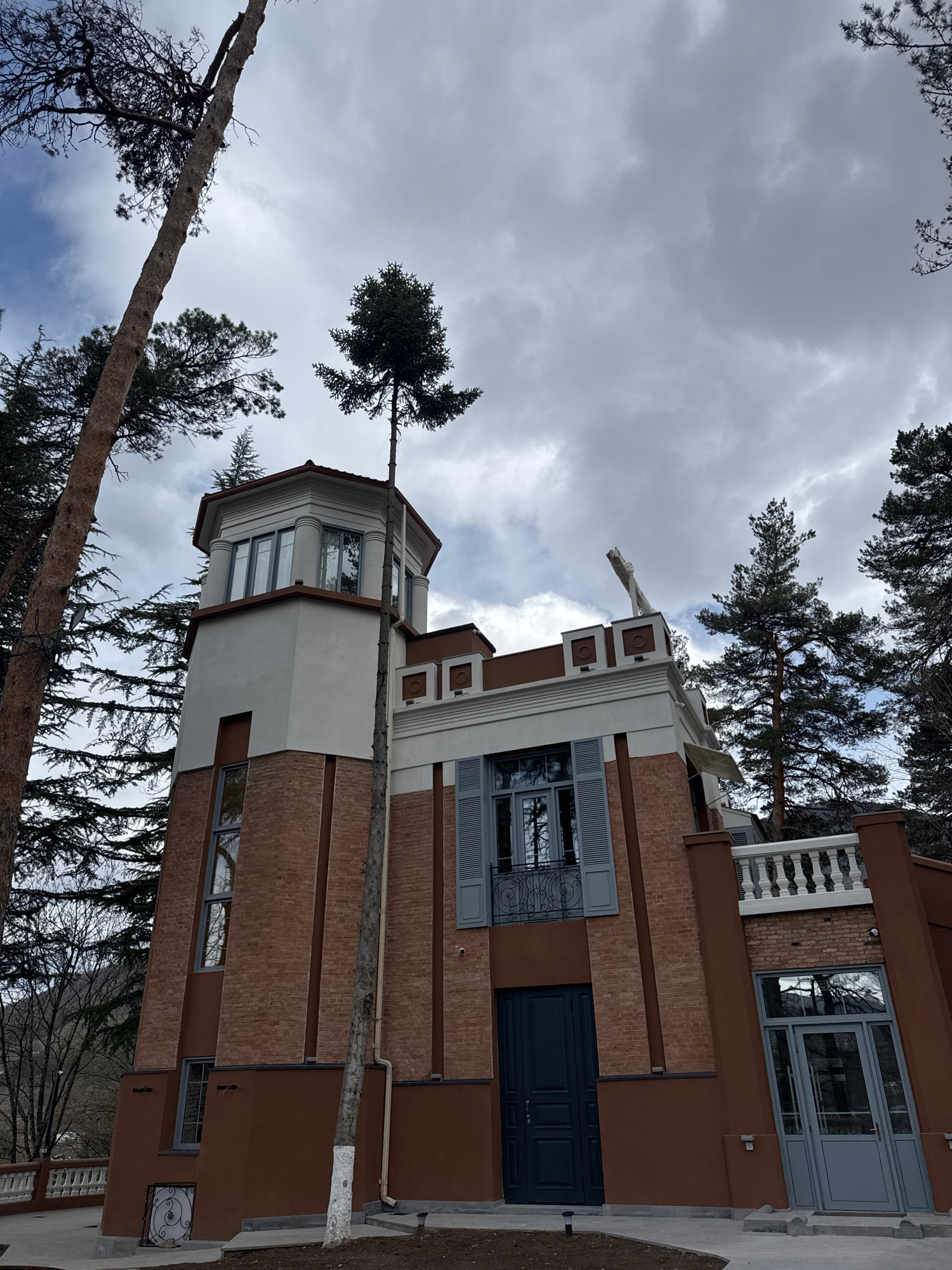 The image shows a multistory building in Dilijan, Armenia. The building has a unique architectural style, combining brickwork with painted surfaces. It features a tower-like structure at one end and d…read more