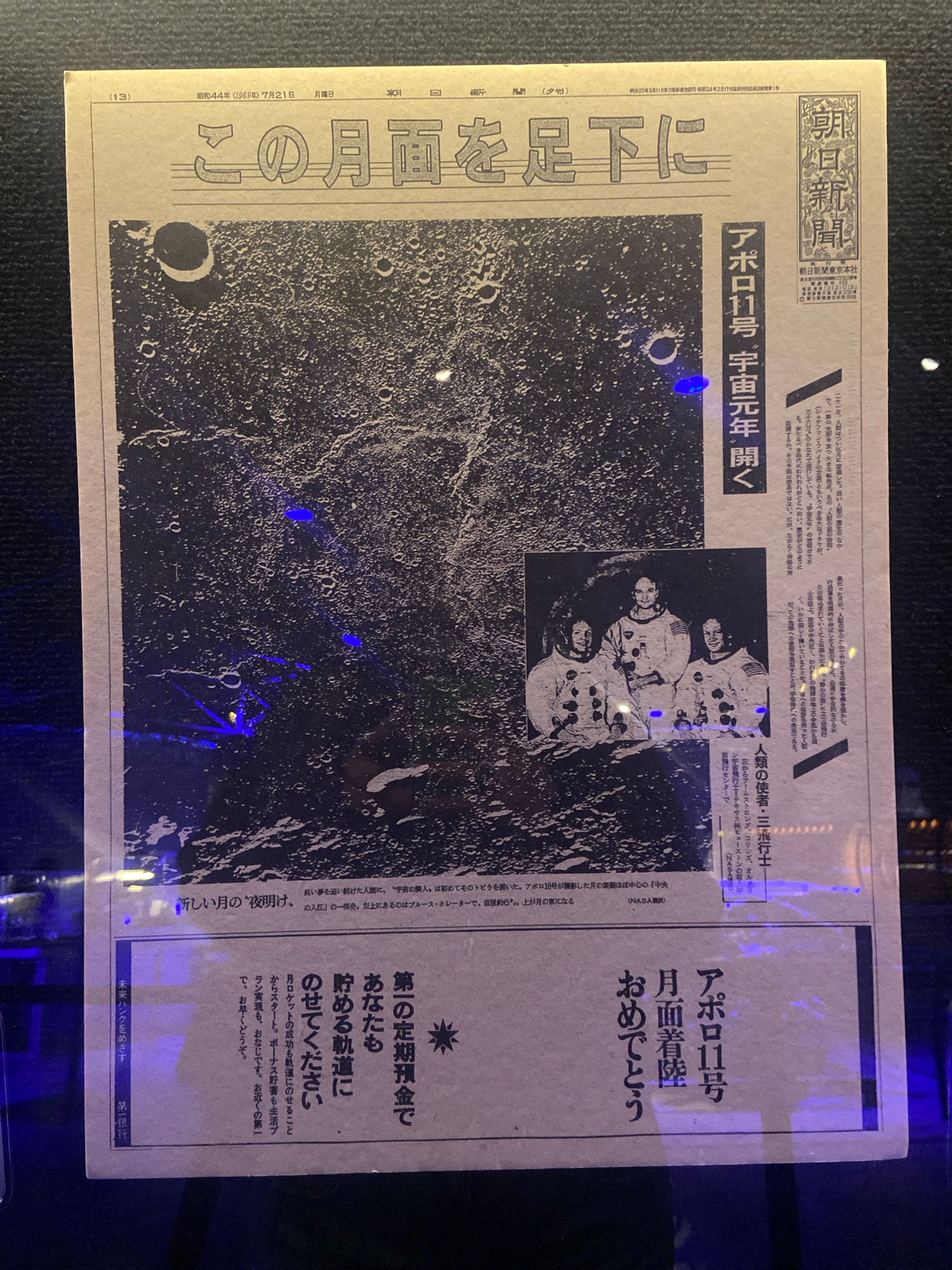 The image shows a framed Japanese newspaper article about the Apollo 11 moon landing. The article features a grainy, black and white photo of the moon's surface with craters, alongside a picture of th…read more