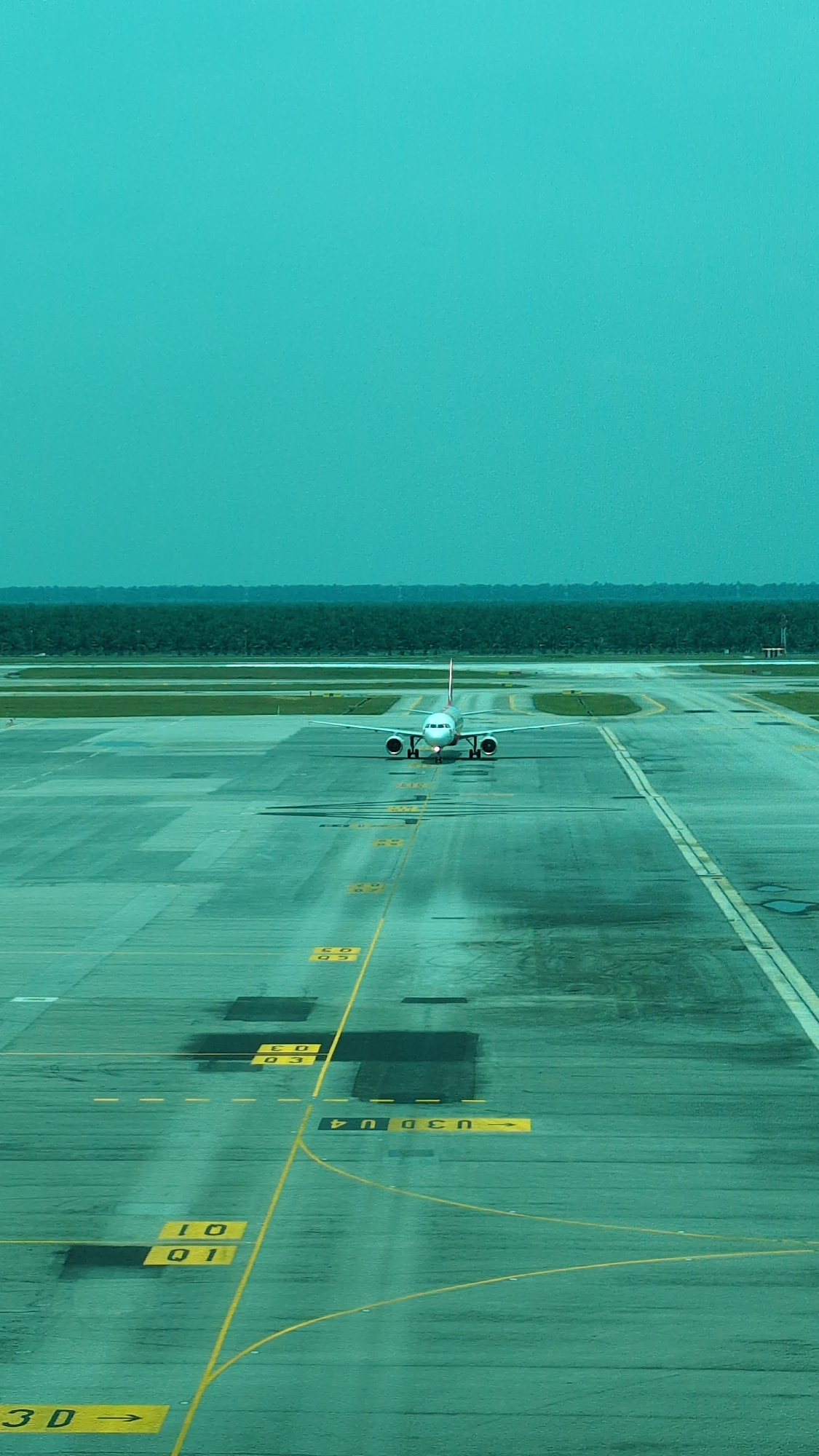 The image, oriented vertically, captures an aerial or elevated view of an airport scene. A white commercial jet, equipped with two under-wing engines and red/dark accents on its tail, is positioned on…read more