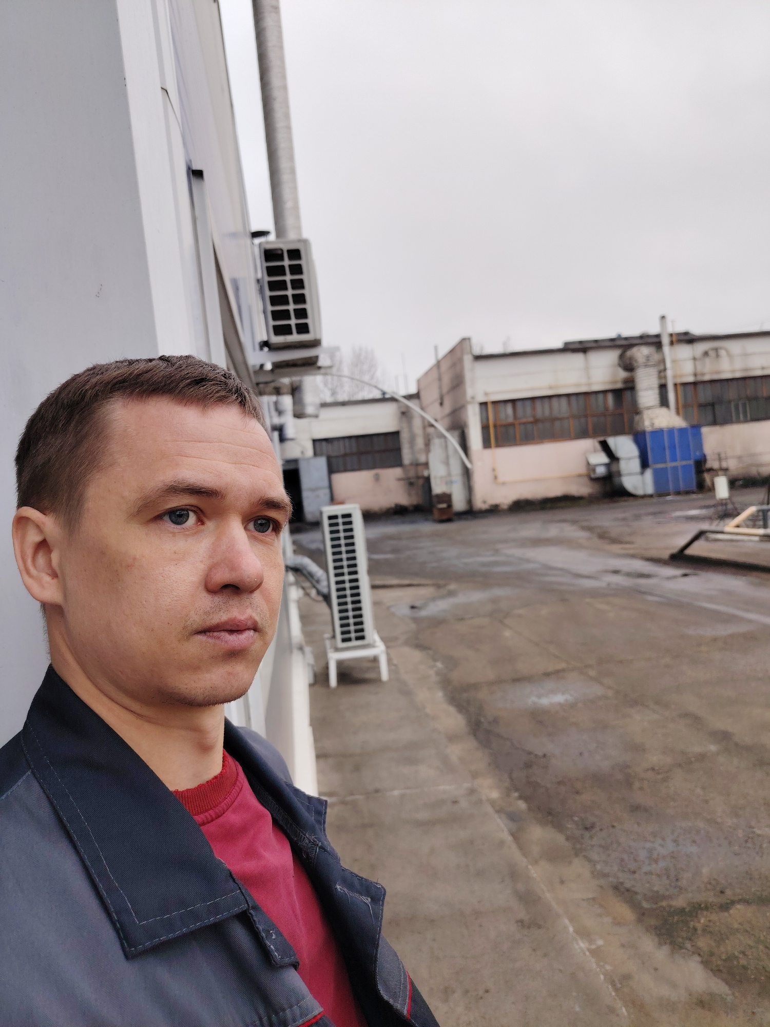 A medium shot depicts a man in the foreground, slightly left of center, wearing a red shirt beneath a gray or blue work jacket. He gazes to the right. The background features an industrial outdoor are…read more