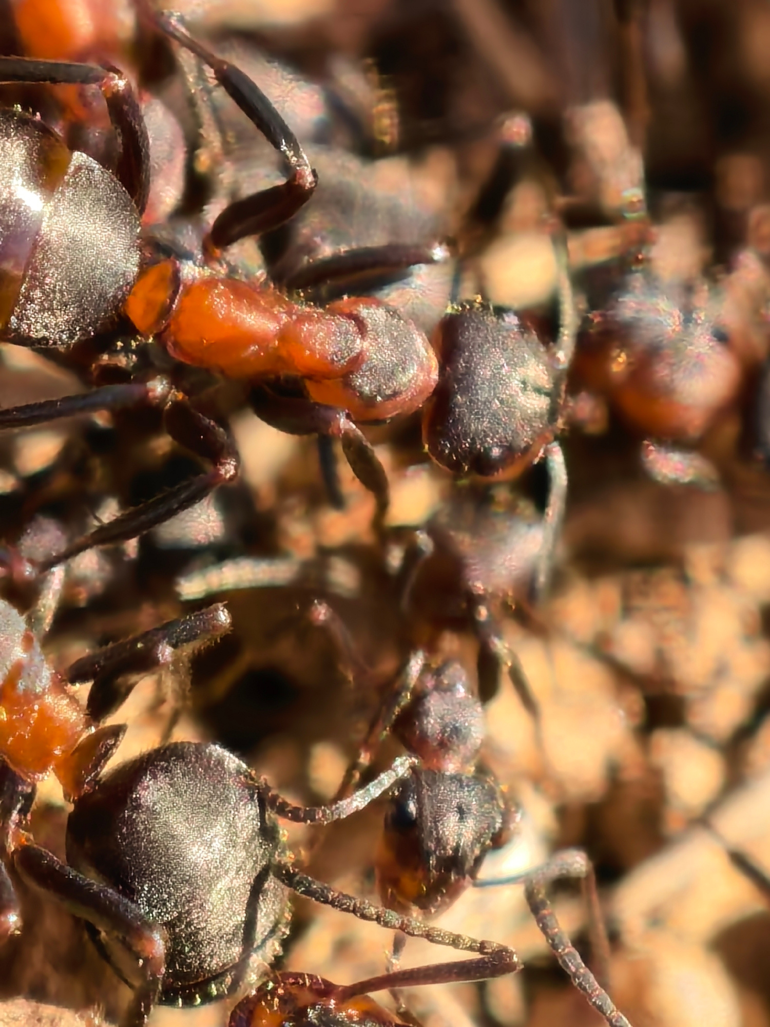 The image shows a close-up view of a cluster of ants. The ants are reddish-brown to black in color and have a segmented body. They are densely packed together, obscuring the background. The location a…read more