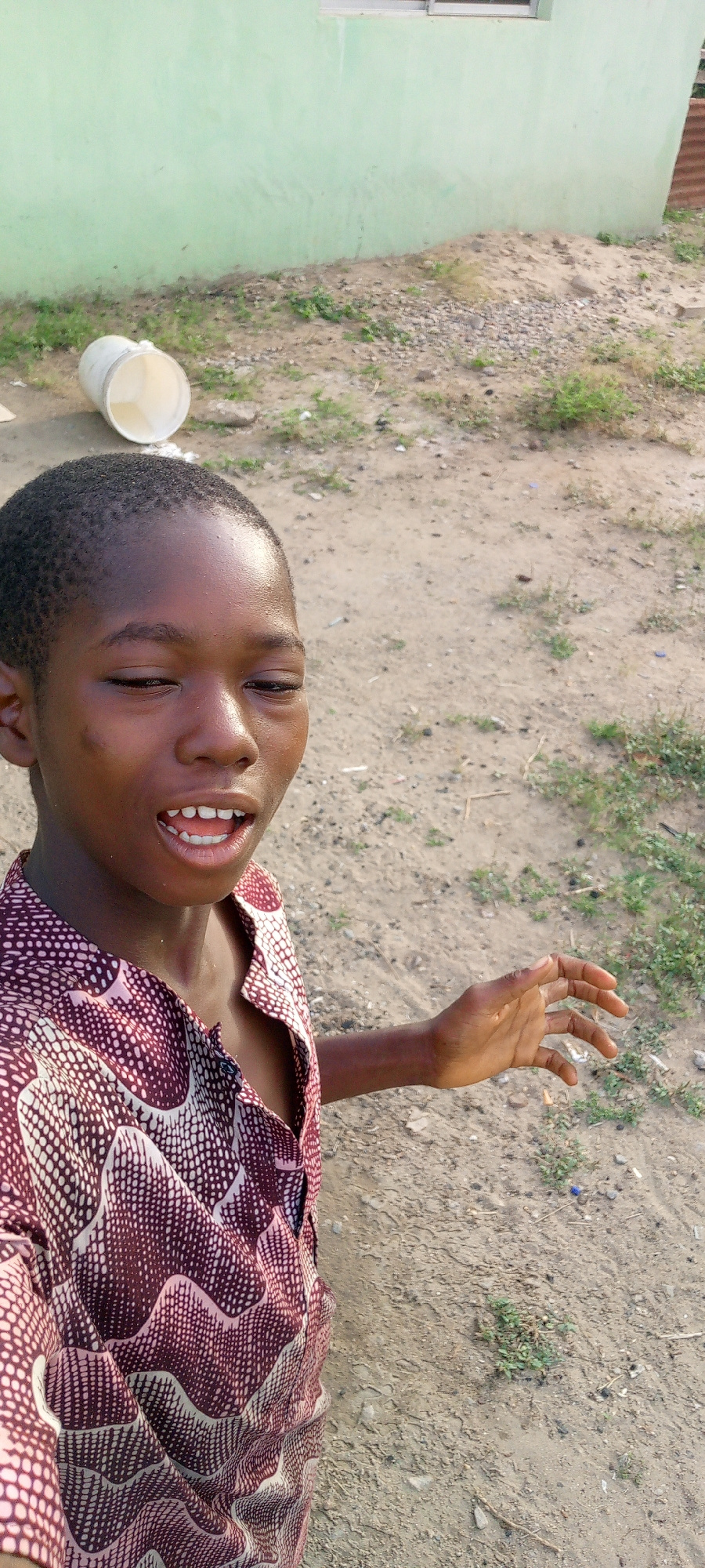 A person, likely a young male, is standing in an outdoor area. He has dark skin, short black hair, and is wearing a patterned button-up shirt. He is speaking or smiling, with his mouth open, and his r…read more