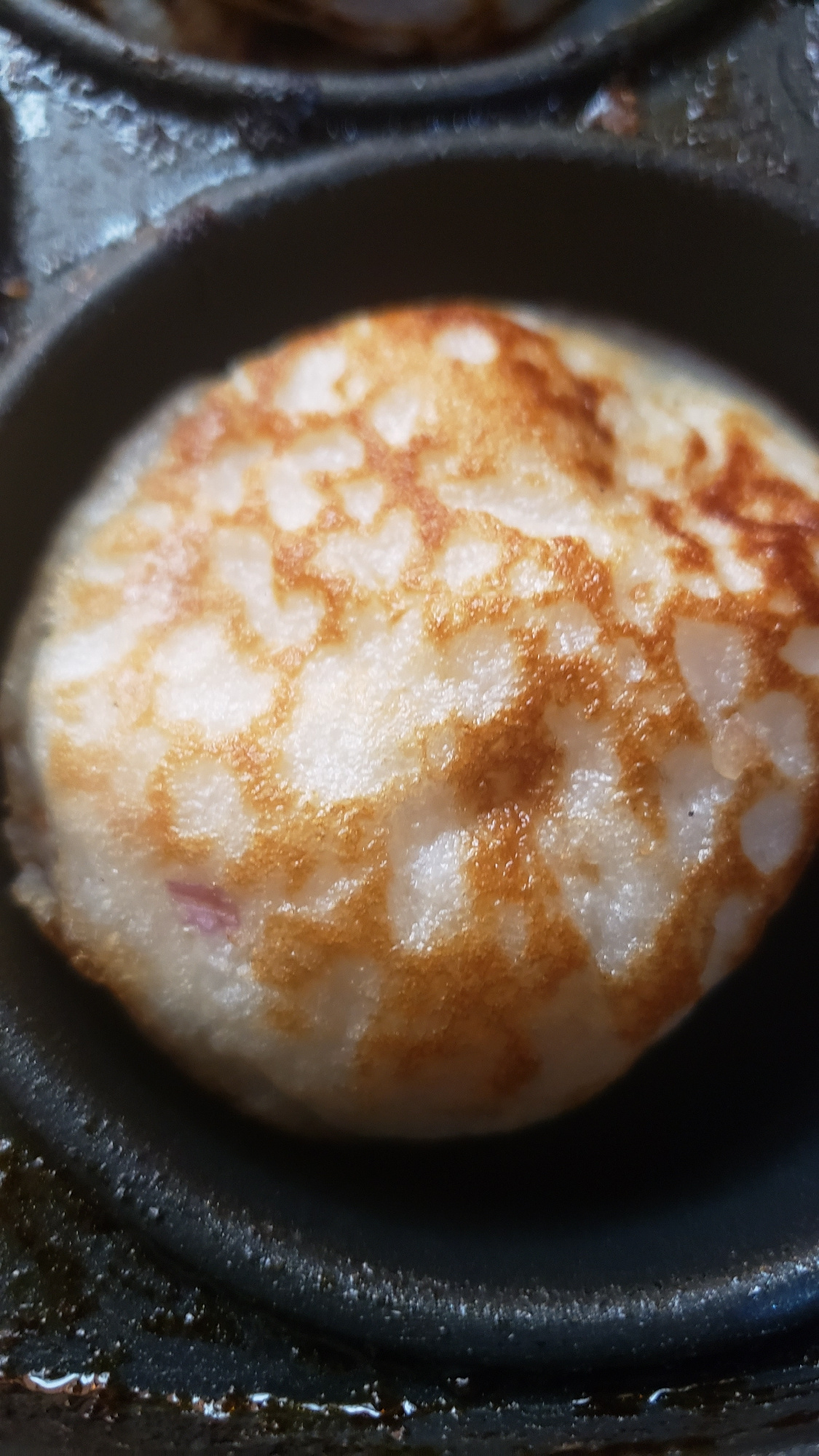 A close-up, high-angle shot captures a single, round food item, resembling a small pancake or puff, nestled within a dark, circular depression of a cooking pan. The food item displays a creamy off-whi…read more