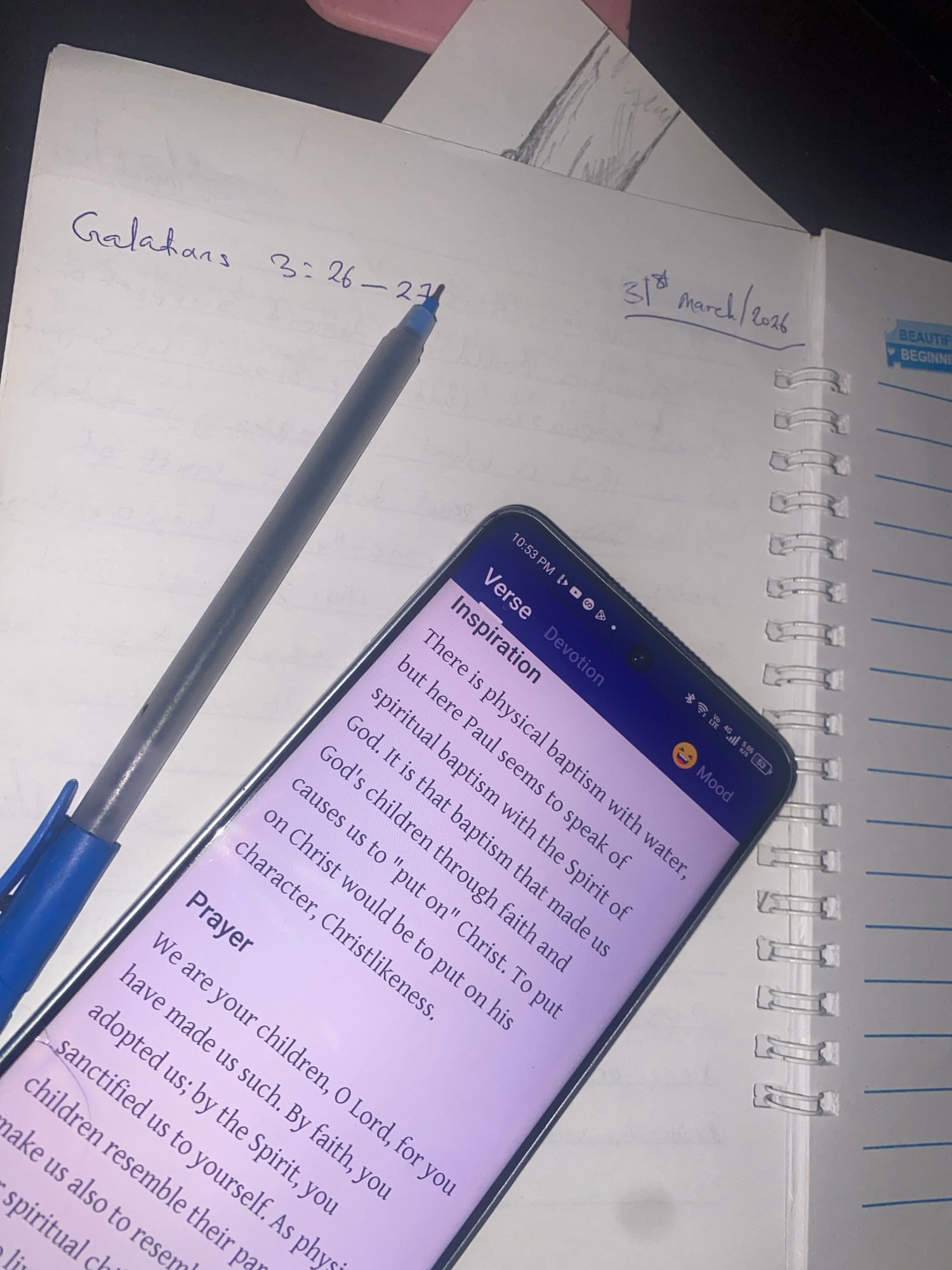 A notebook, a pen, and a mobile phone are arranged on a desk. The notebook on the left side has a handwritten date "31st March/2026" and the scripture reference "Galatians 3:26-27." A blue ballpoint pā¦read more
