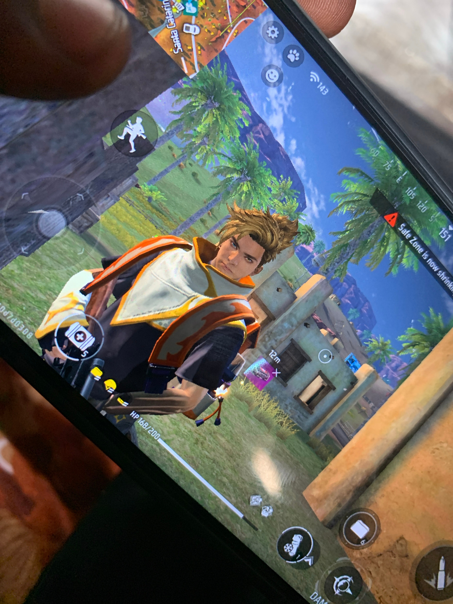 A mobile phone screen displays a first-person perspective of a video game set in a tropical environment. The character, a male with blonde hair and orange and white clothing, is the focal point. Palmβ¦read more