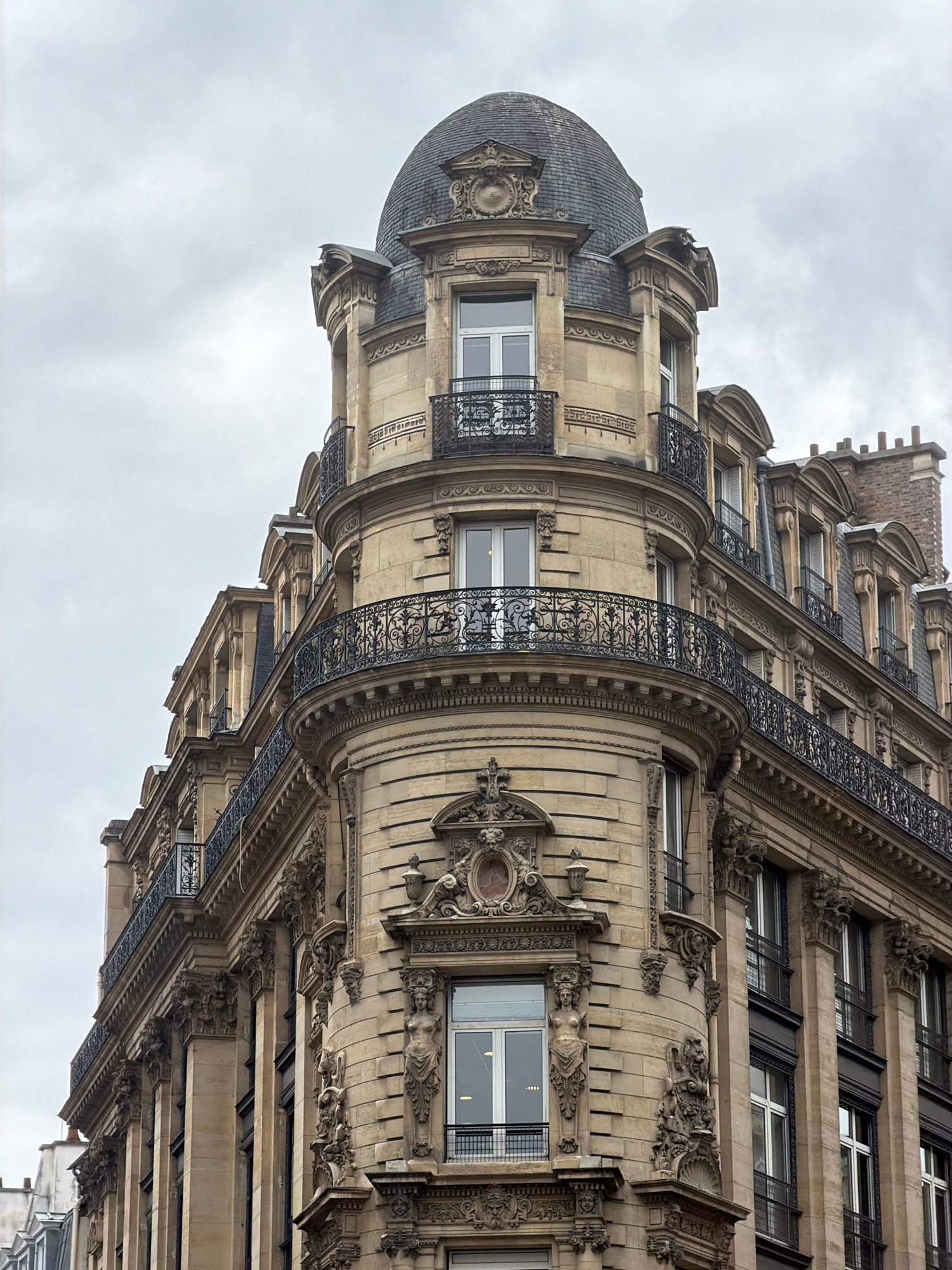 The image depicts a low-angle view of a building in Paris, France. The architecture is ornate, featuring light-colored stone, decorative carvings, and black wrought-iron balconies. The building has a…read more