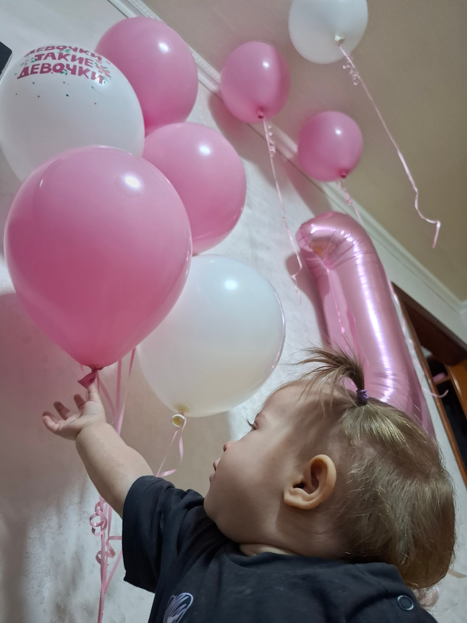 A young child with blonde hair pulled back in a small ponytail is reaching towards a pink balloon. The child is wearing a black shirt. Several other pink and white balloons are nearby, some with writi…read more