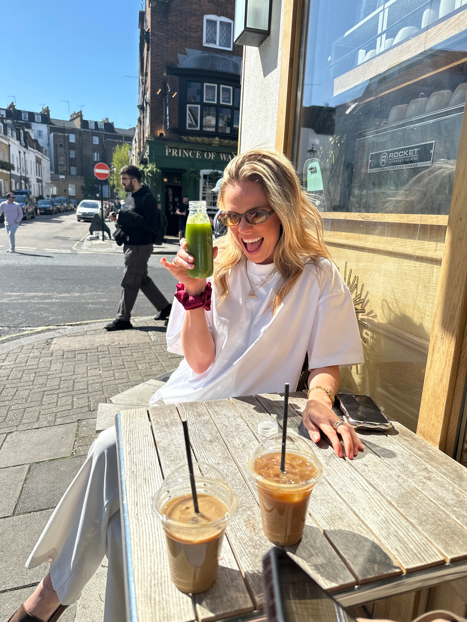 The image captures a woman sitting at a wooden table outside a café, holding a green juice bottle in her left hand and smiling at the camera. She is wearing a white shirt and glasses. Two iced coffees…read more