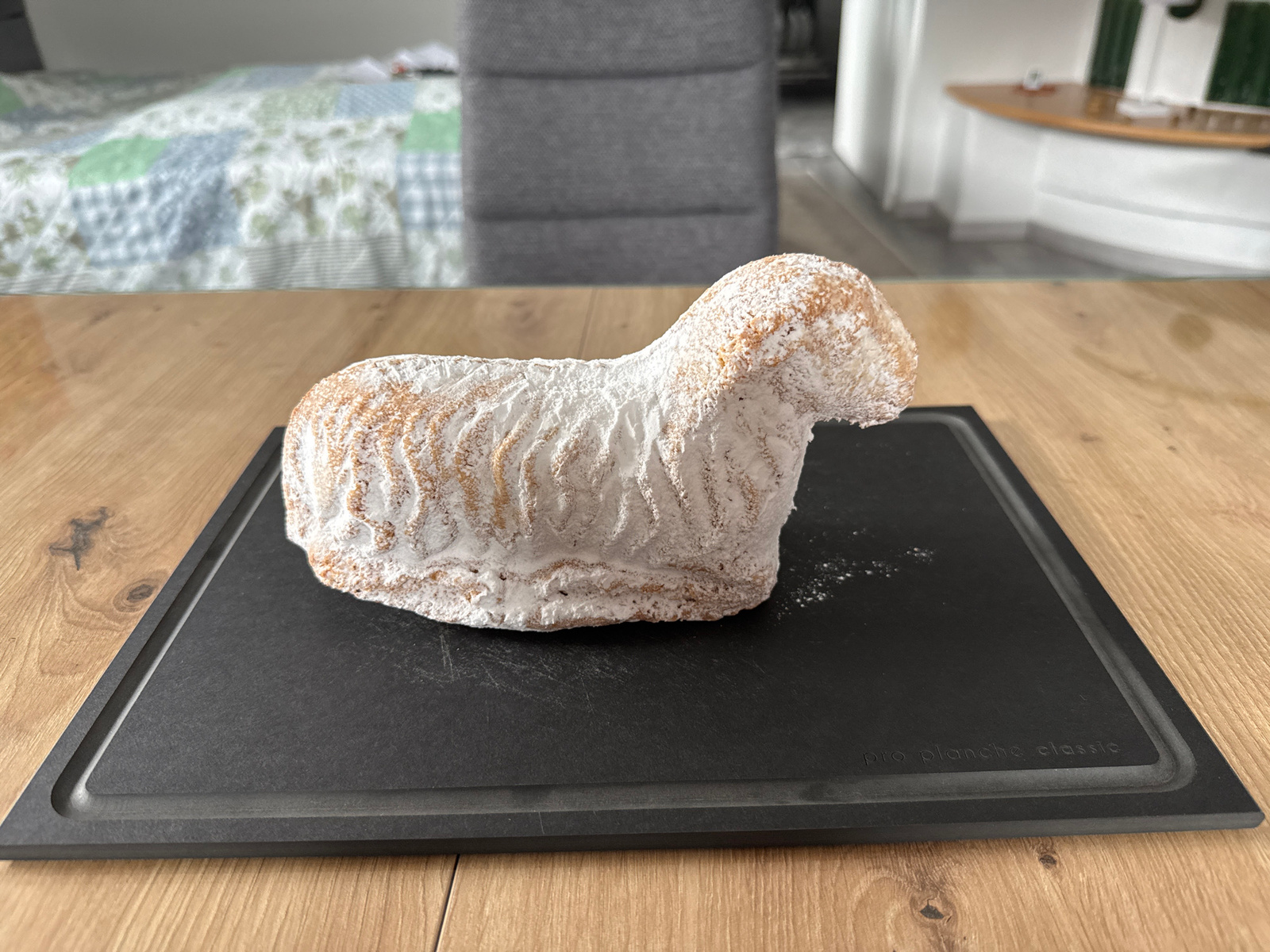 A lamb-shaped cake, dusted with powdered sugar, sits on a black rectangular serving board. The board is on a light brown wooden table. In the background is a bed with a patterned bedspread, a gray cha…read more