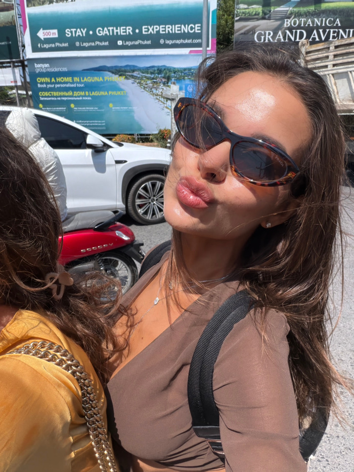 A woman wears sunglasses and poses for a selfie near a billboard advertising Laguna Phuket residences. A white car and a red scooter are parked nearby. She is wearing a brown top with black accents an…read more