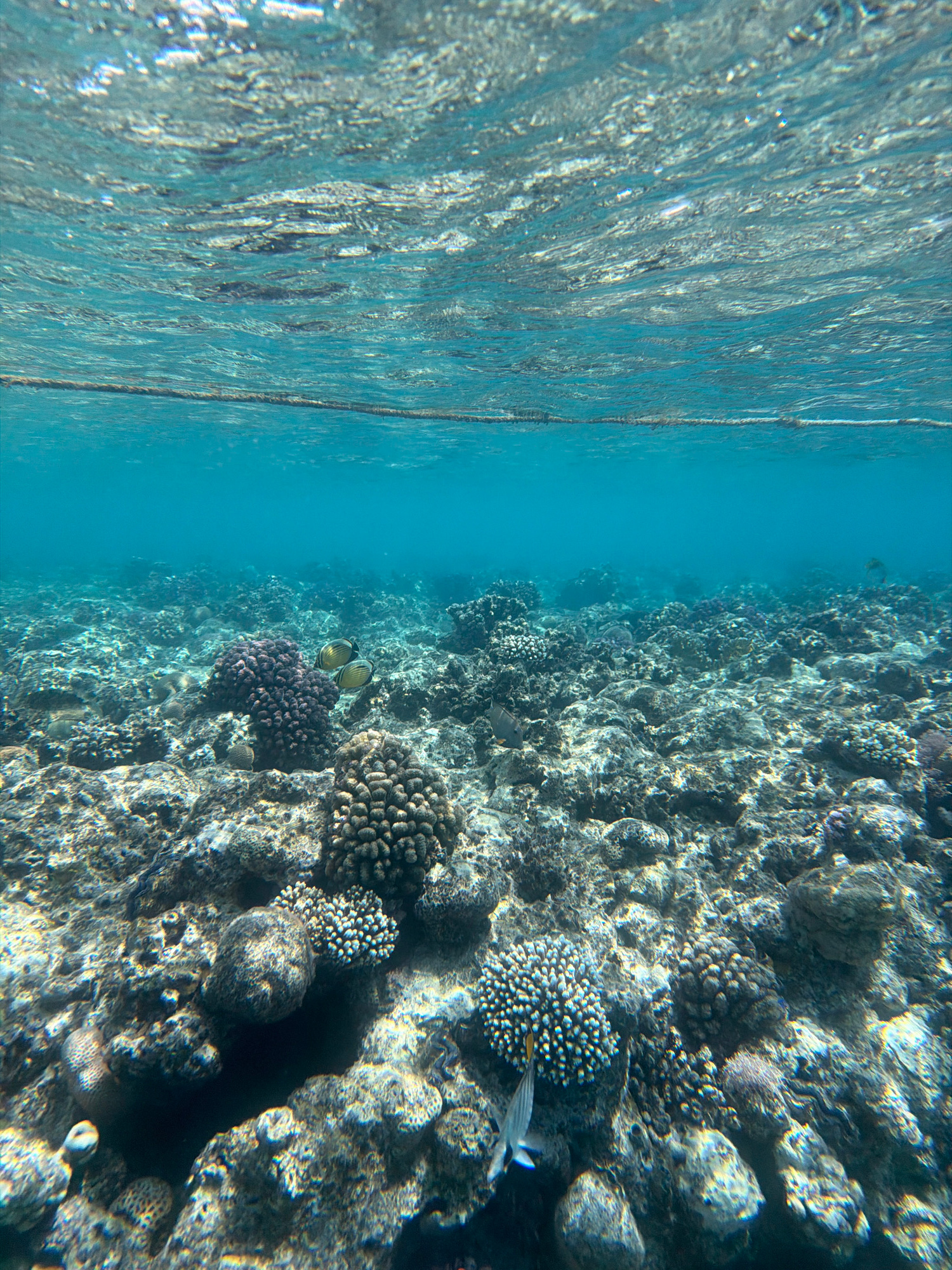 The image displays an underwater scene, captured from a horizontal perspective looking into a vibrant coral reef. The top third of the frame shows the shimmering surface of the water, characterized by…read more