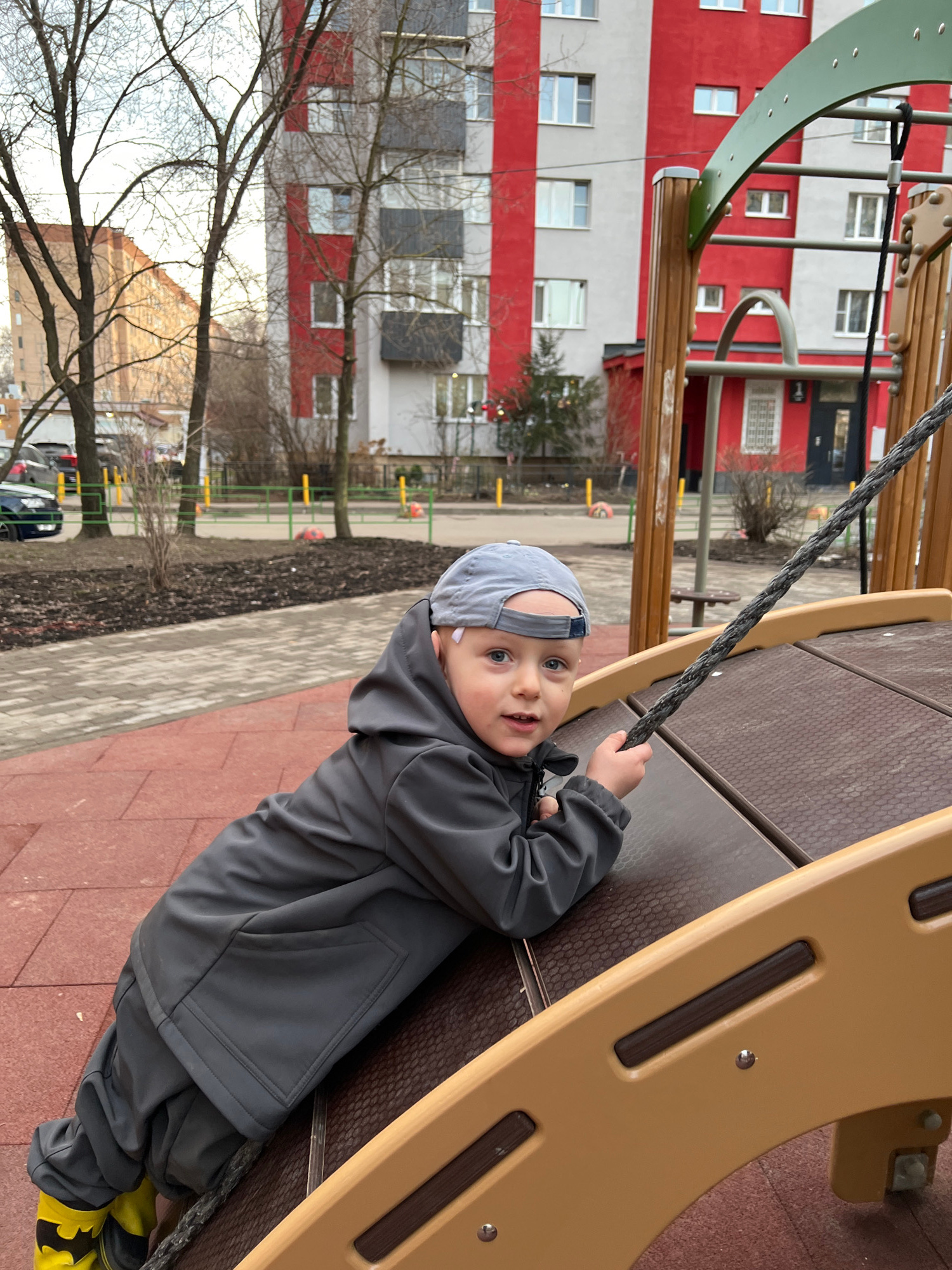 A young child, wearing a gray hooded jacket, pants, and a baseball cap, is on playground equipment. The playground is located in Mytishchi, Russia. The child is gripping a dark-colored rope attached t…read more