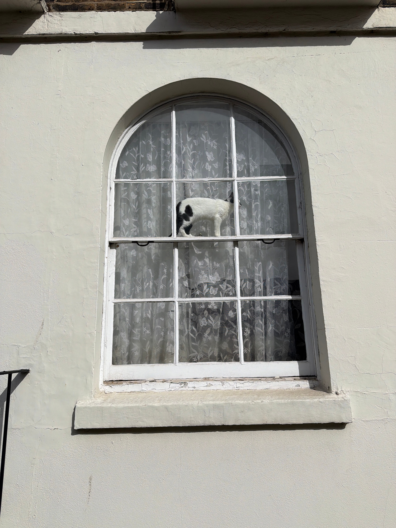 A cat with white and black fur is positioned between the open sections of a white-framed window. The window, set in a light-colored wall, is divided into rectangular panes and features a semi-circular…read more
