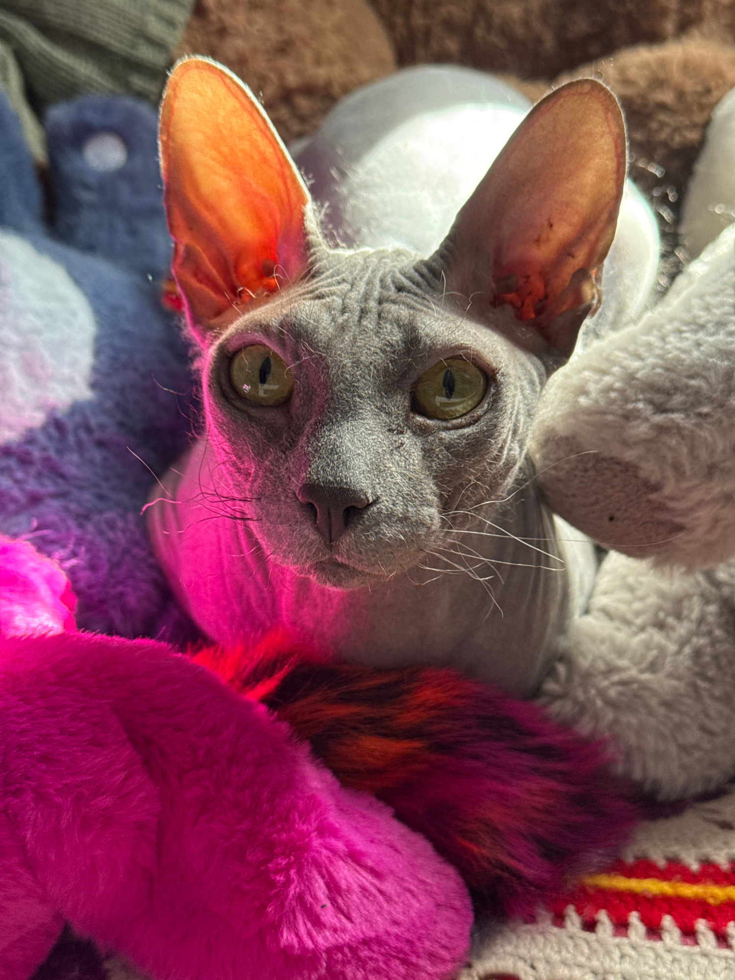 A close-up, high-angle shot depicts a hairless cat, likely a Sphynx, nestled among several stuffed animals and a crocheted blanket. The cat has grey skin, large, pointed ears that are pink inside, and…read more