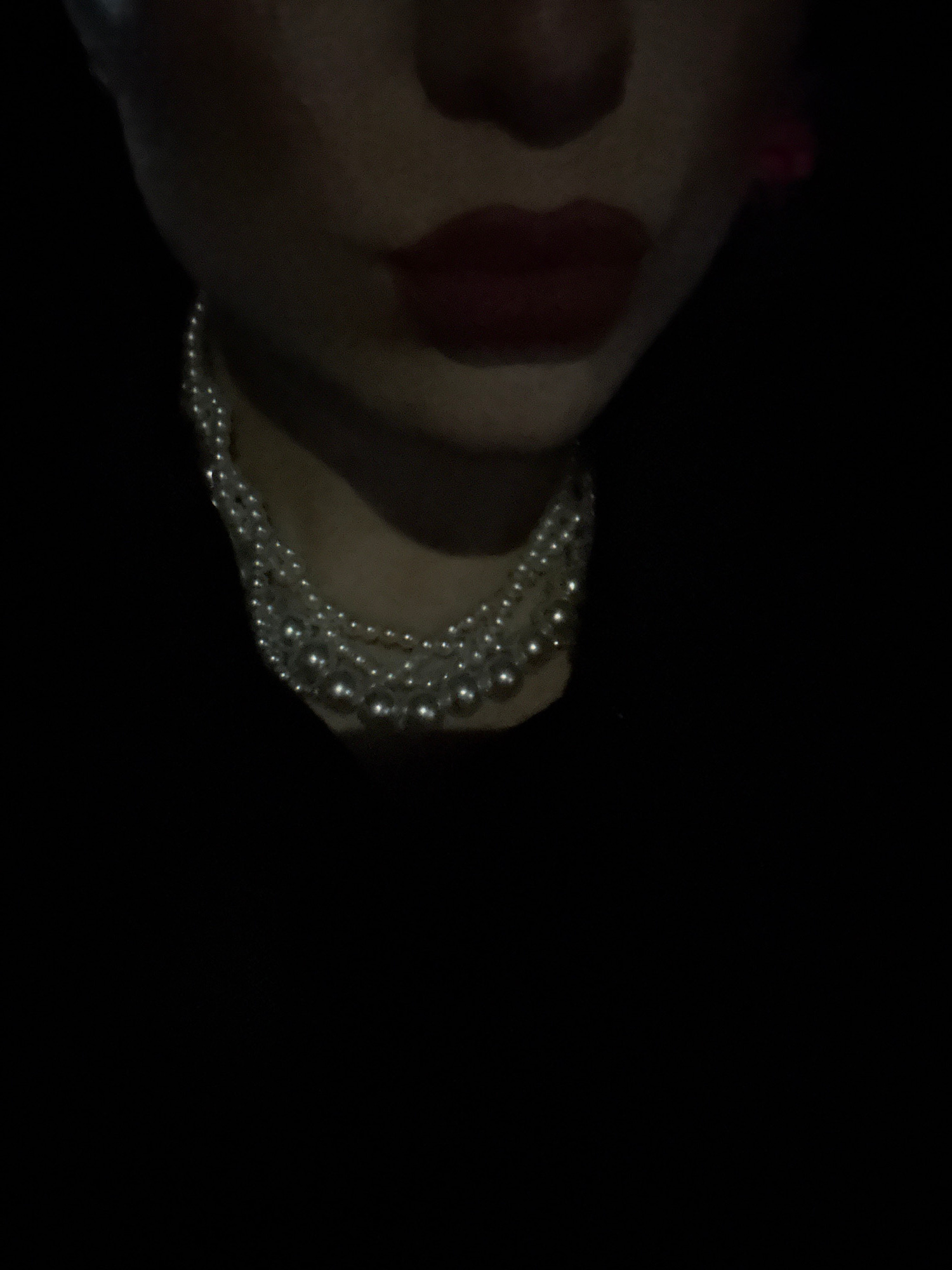 A close-up shot in low lighting shows a portion of a person's face and neck adorned with a pearl necklace. The face is partially visible, showing the nose, cheek, and lips, which have dark red lipstic…read more