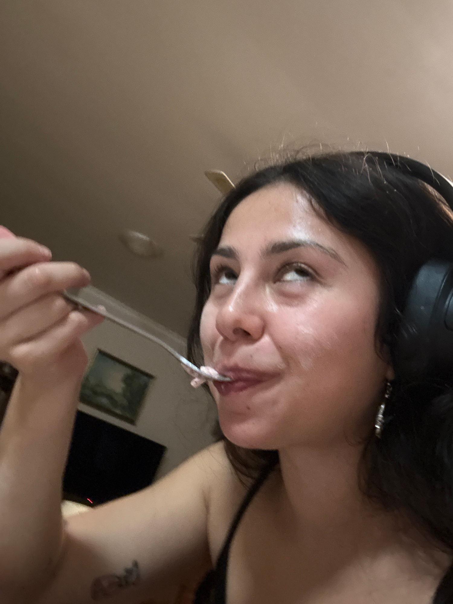 A woman with dark hair is eating something with a fork. She is wearing black headphones. She has a small tattoo on her upper arm. The setting is indoors, with a painting visible on the wall in the bac…read more