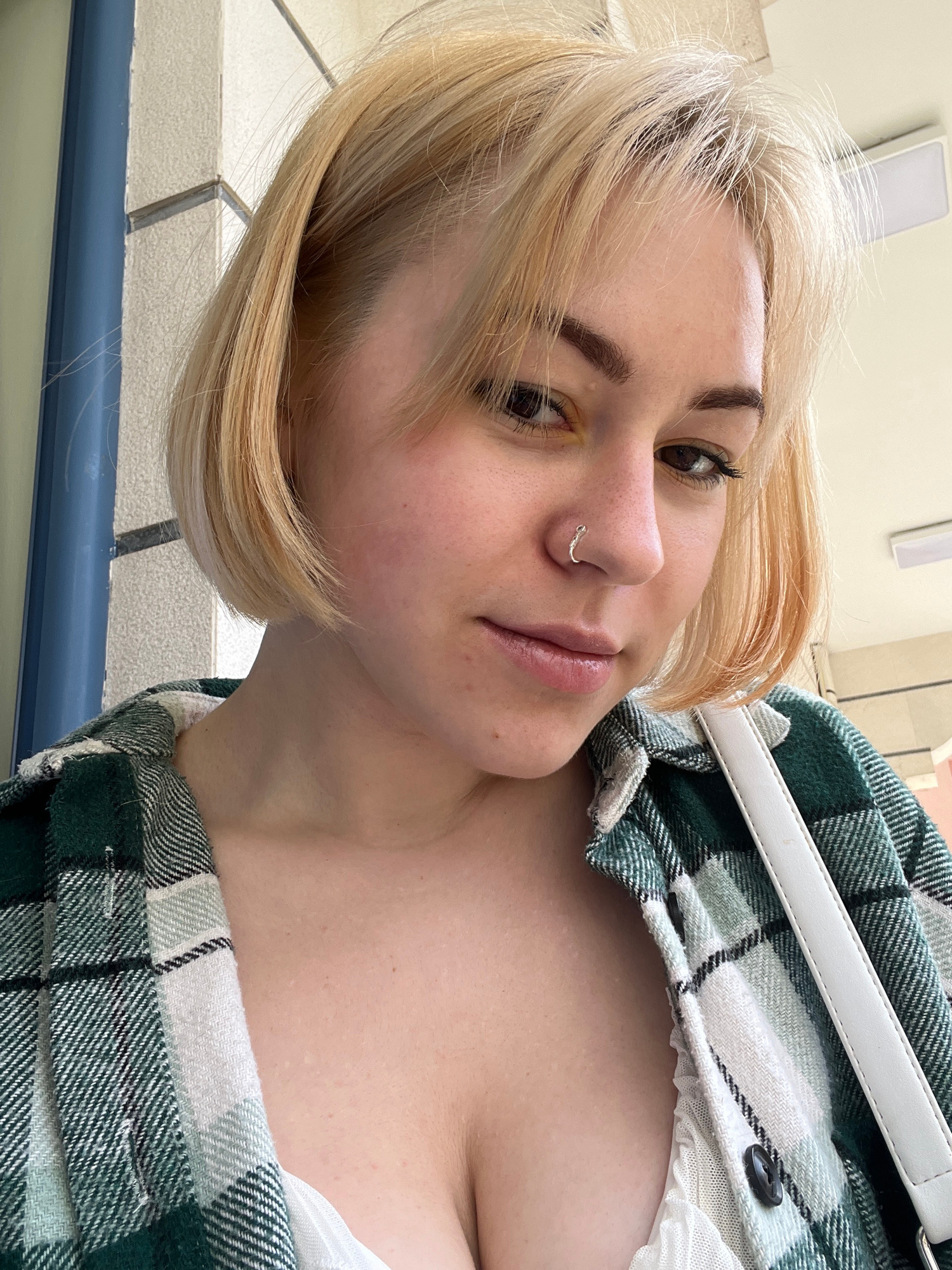 The image presents a young woman with blonde hair, fair skin, and prominent dark eyebrows, captured from a low, tilted angle. She is looking towards the camera with a neutral to slightly serene expression. A silver ring is visible as a piercing on her left nostril, and her lips appear glossy. She is wearing an open green, white, and black plaid shirt or jacket, which partially reveals a hint of a white, possibly ruffled, garment underneath. A white strap, likely from a bag or purse, diagonally crosses her upper body. The background suggests an indoor setting, with light-colored tiled surfaces visible, possibly on walls or flooring. A segment of a blue railing or banister can be seen towards the bottom of the frame, hinting at a hallway or stairwell environment. A rectangular light fixture is mounted on the wall in the upper portion of the background. The lighting in the image suggests daytime or a well-lit indoor space. The location context provided indicates the scene is in Budva, Montenegro. There is no visible text in the image. | Open Wire