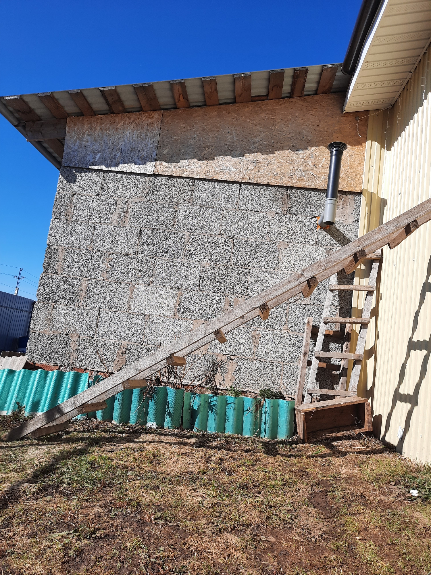 The image shows the exterior of a building in Krasnogorskoye, Russia. The building's siding consists of various materials including wood paneling and textured gray blocks. A section of the wall has a…read more
