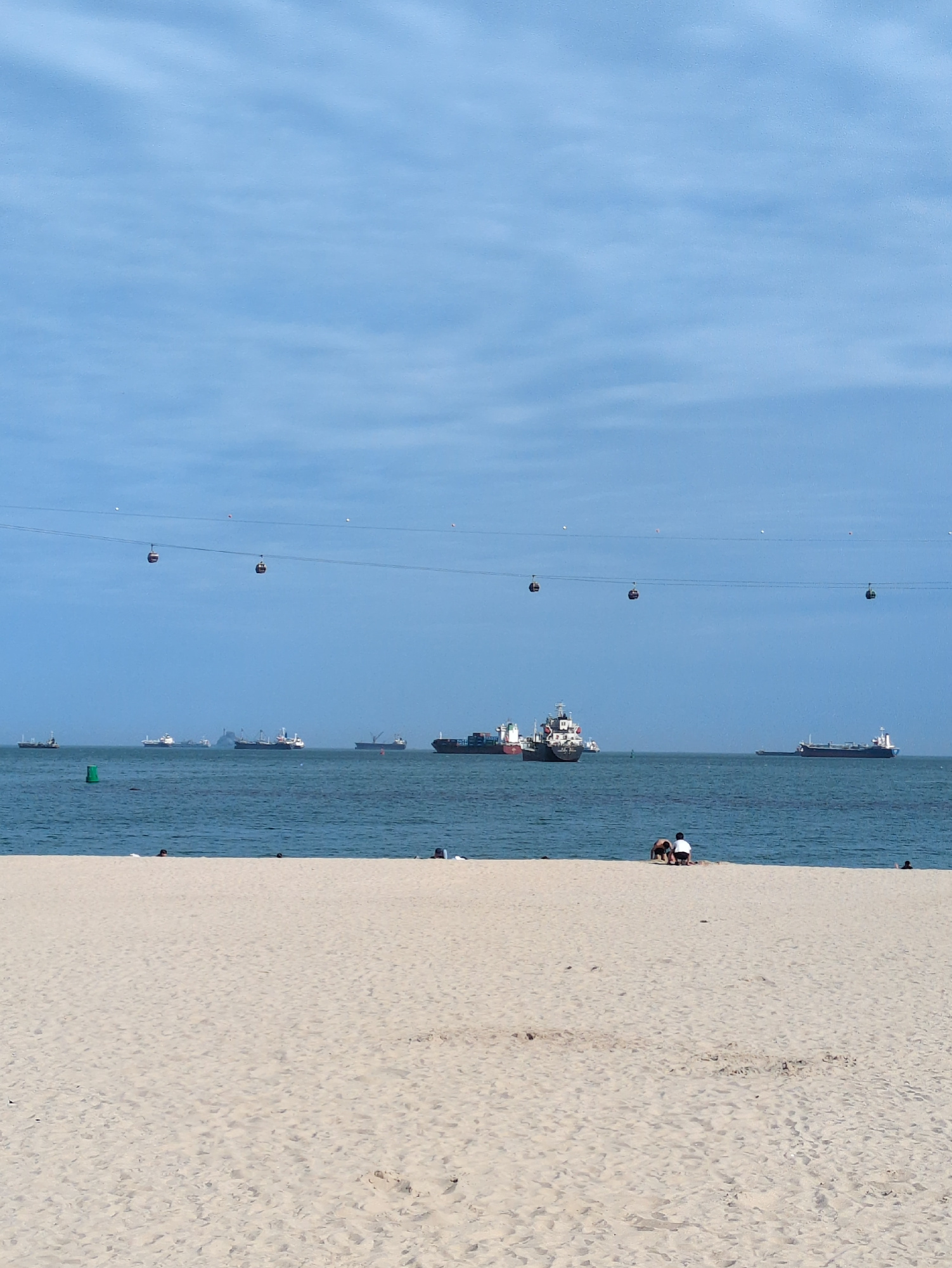 The image shows Haeundae Beach in Busan, South Korea. The photo is taken from the beach, looking out towards the sea. The beach is sandy, and the water is blue. There are several cargo ships on the ho…read more