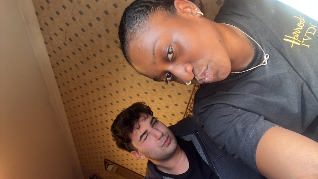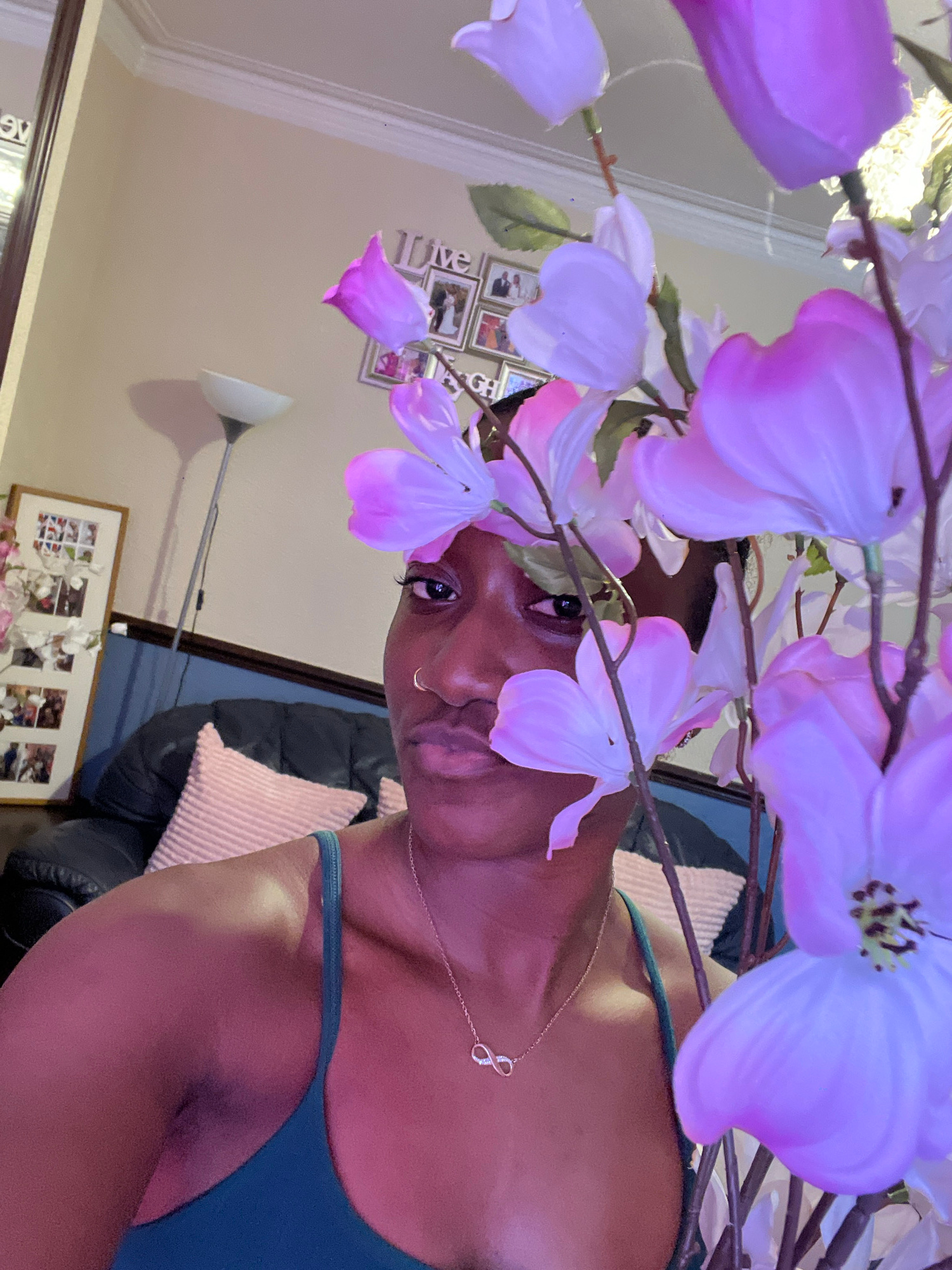 A medium shot, rotated counterclockwise, shows a person of color among pink flowers indoors. The person wears a green top and a silver infinity symbol necklace. A small gold hoop earring is visible in…read more