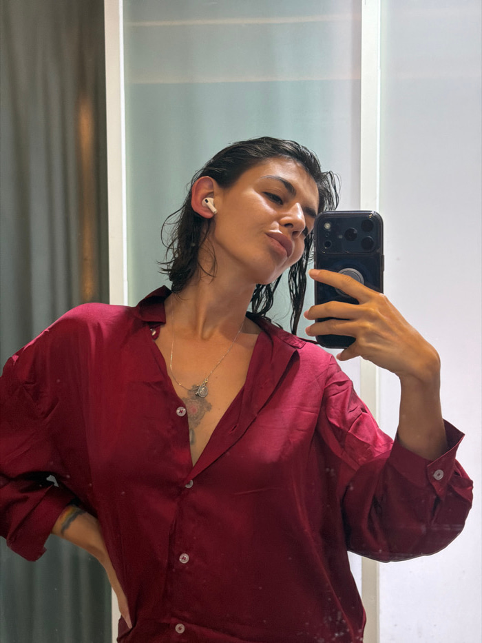 One adult female subject is depicted in a waist-up mirror selfie. Her dark hair appears wet and is styled away from her face. She is wearing a loose-fitting, maroon-colored collared shirt, unbuttoned…read more