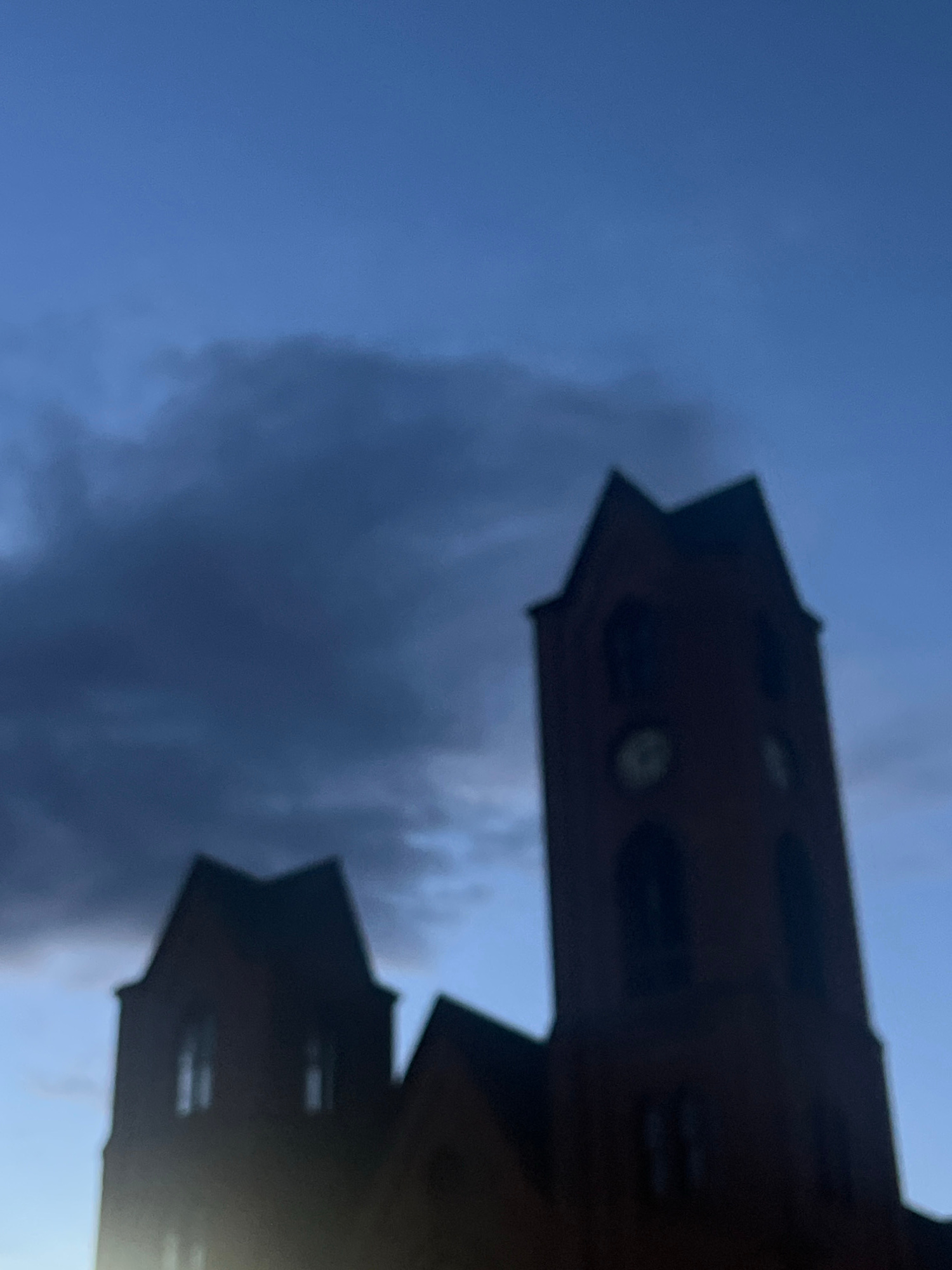 The image shows a low-angle view of a dark-colored, multi-story building against a predominantly blue sky with a cloud formation. The building appears to have a clock on one of its levels. The image i…read more