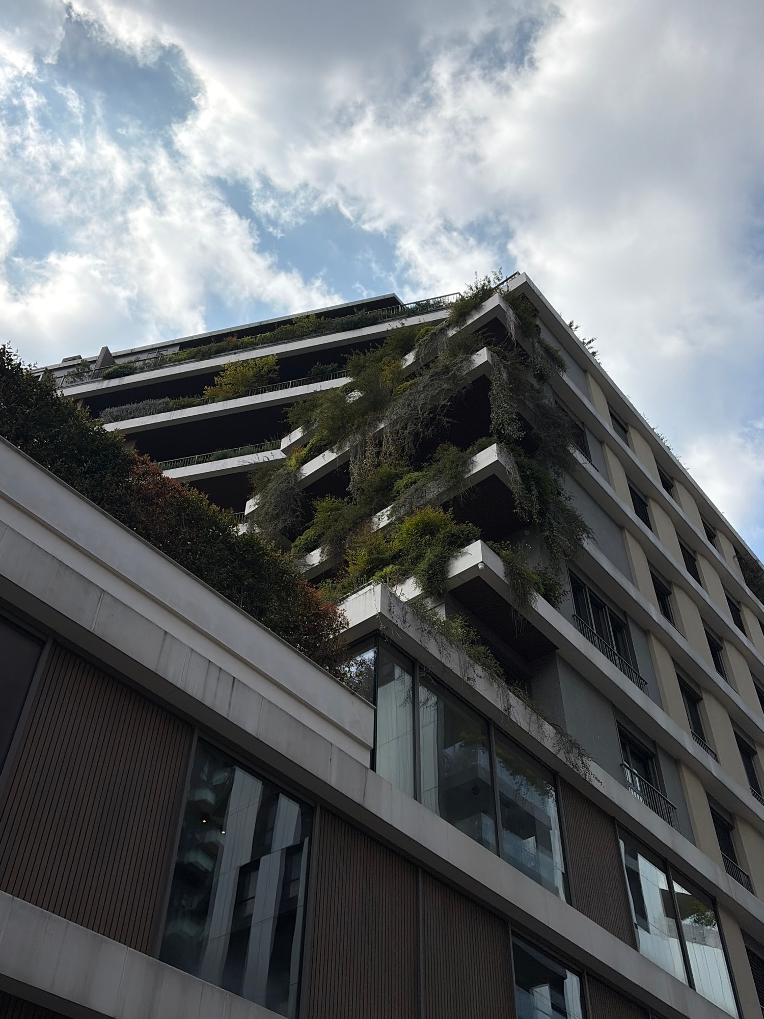 The image shows a low-angle view of a multi-story building with a modern design. The building's facade features horizontal tiers with greenery cascading from the edges, resembling vertical gardens. Wi…read more