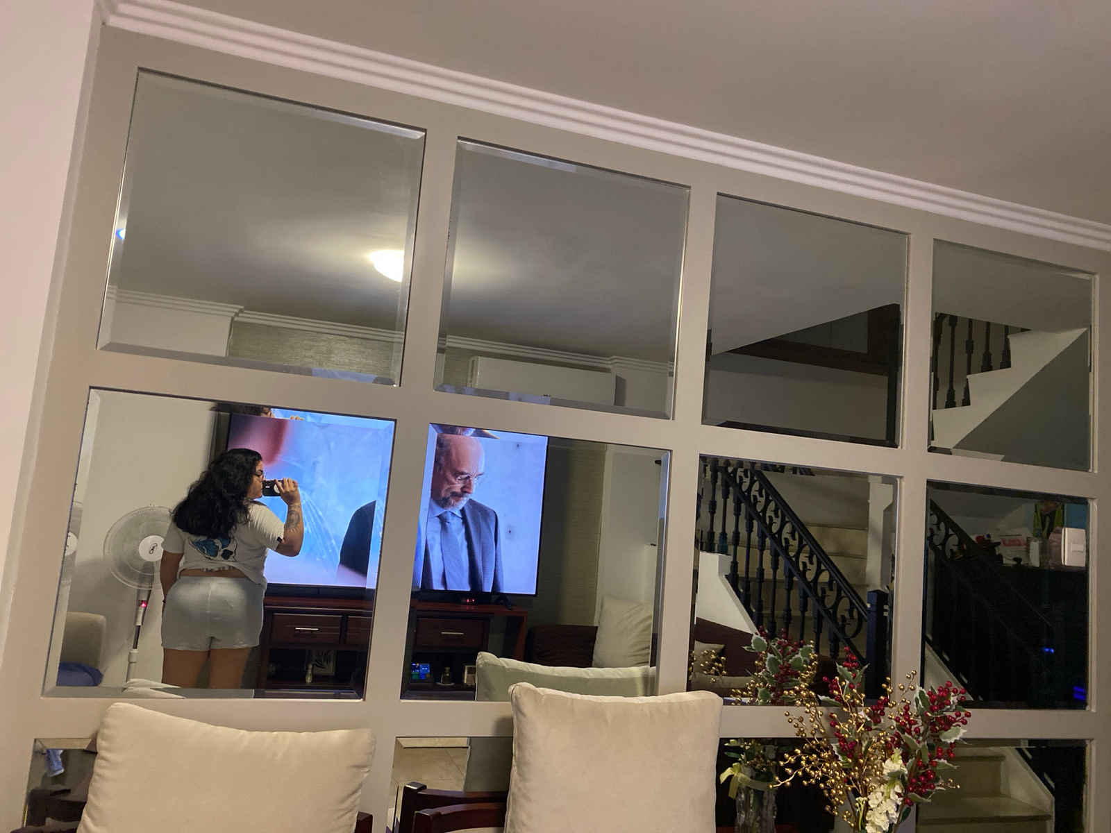 A residential interior is depicted, featuring a wall adorned with a grid of square mirrors. The mirrors reflect various aspects of the room, including a woman drinking from a container, a television dā¦read more