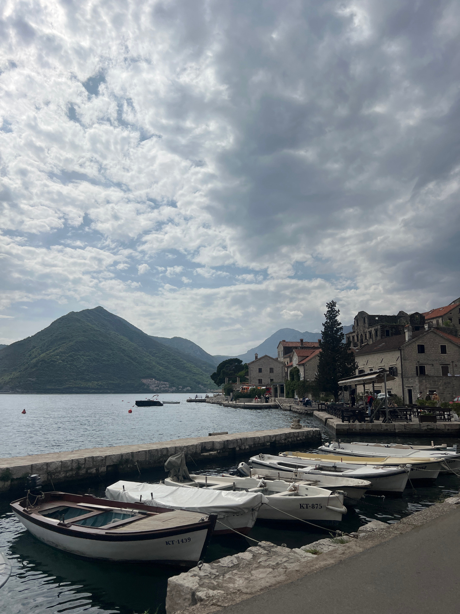 This image presents a serene view of a picturesque coastal town, identified as Perast, Montenegro, set against a dramatic backdrop of lush green mountains under a cloudy sky. In the foreground, a sto…read more