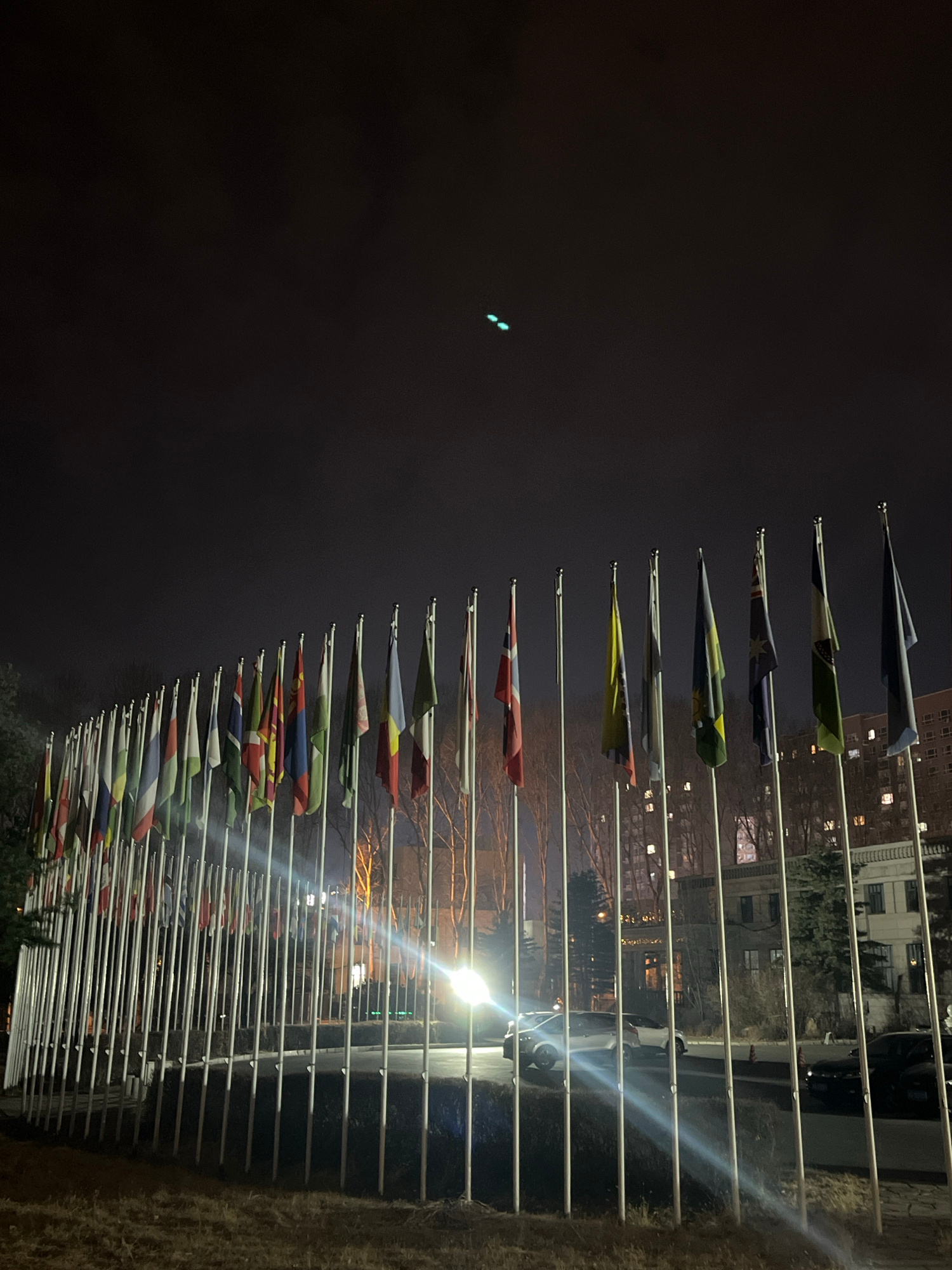 A nighttime, outdoor scene in Changchun City, China, depicts a large array of approximately 50-60 national flags displayed on tall, slender white flagpoles. The flagpoles are arranged in multiple, cur…read more