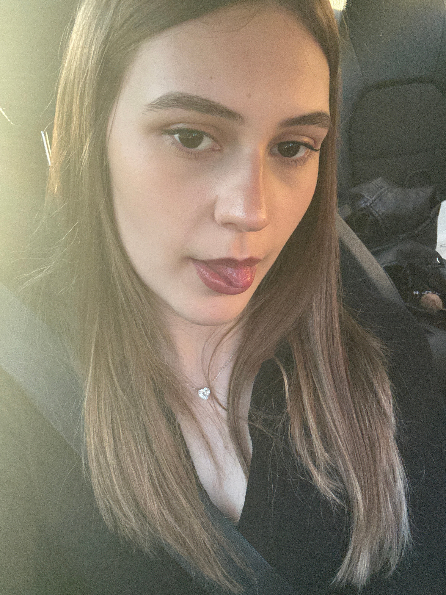 A close-up, tilted portrait of a woman with light brown hair and brown eyes. She is wearing a silver necklace with a heart-shaped pendant. Her lips are colored with a glossy, mauve shade. The backgrou…read more