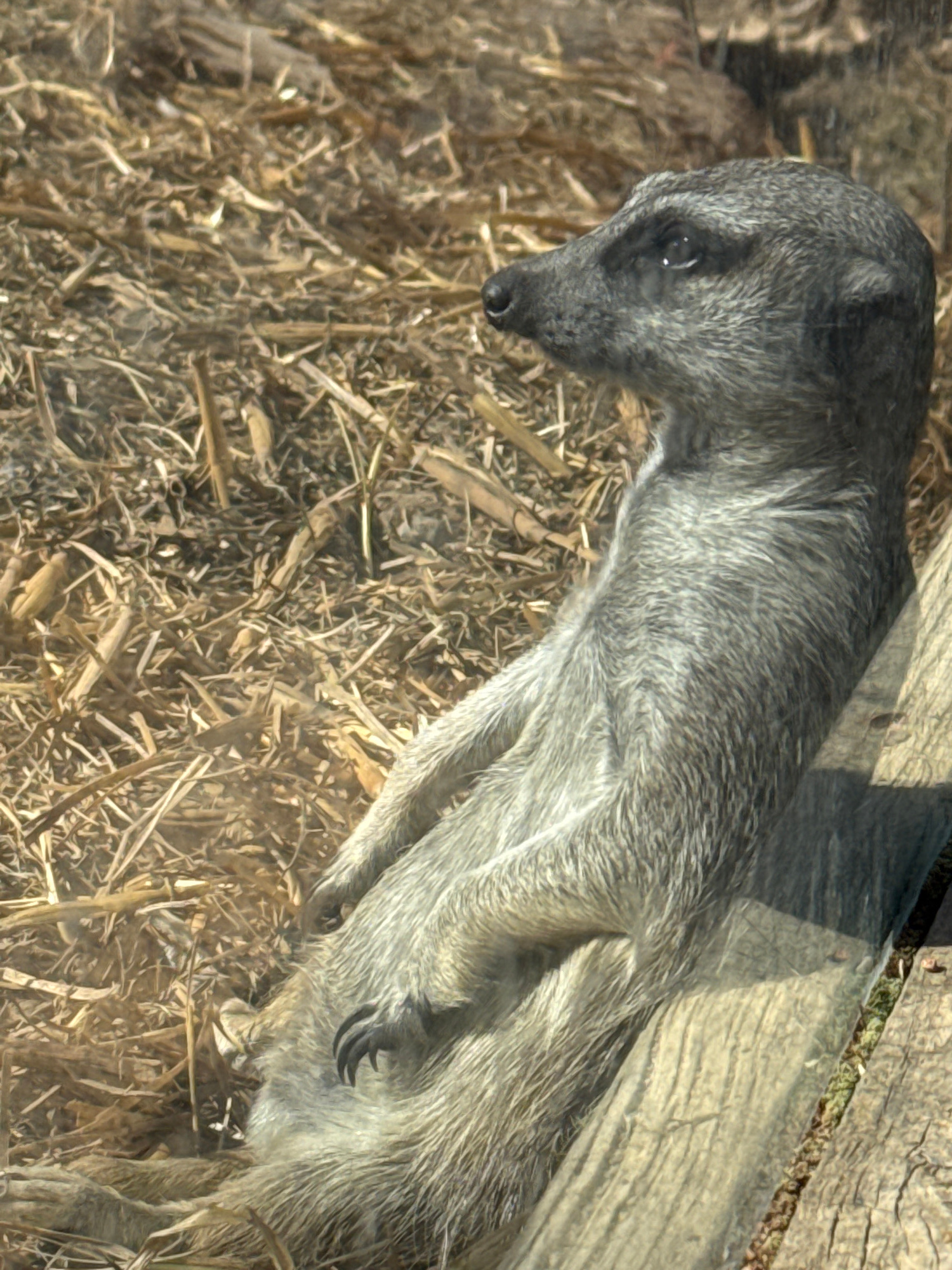 A meerkat lies on its side in a bed of straw, partially obscured by a clear barrier, possibly glass or plexiglass. Its head is turned slightly to the left, revealing its dark eyes and nose. The meerkaβ¦read more