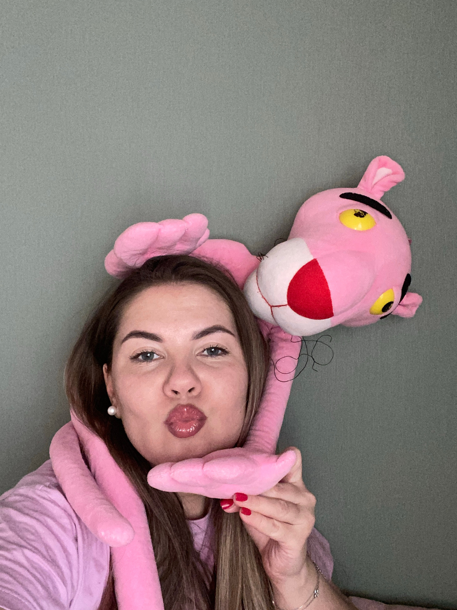 A woman with brown hair, wearing a light pink shirt, lies on a gray surface next to a pink Pink Panther plush toy. She is holding the toy, with its arms wrapped around her face. Her lips are pursed. T…read more